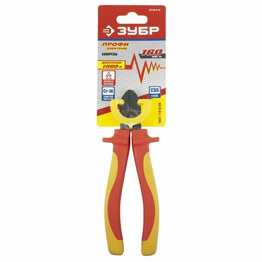 Бокорезы Зубр Профессионал "ПрофиЭлектрик", диэлектрические, двухкомп маслобензостойкая рукоятка, высоковольтные до ~1000В, 160мм, 22145-5-16