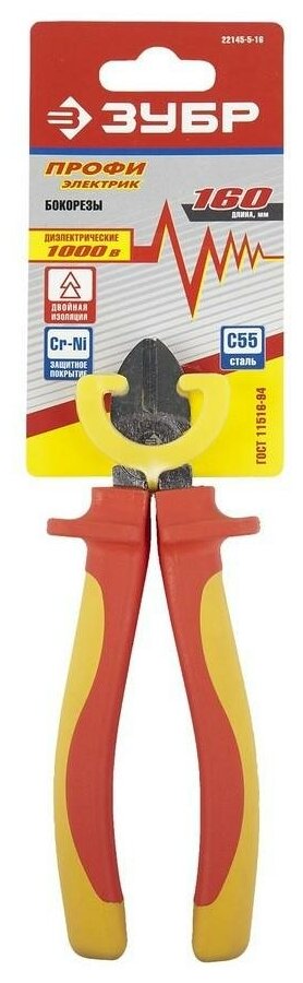 Бокорезы "профиэлектрик", диэлектрические, двухкомп маслобензостойкая рукоятка, высоковольтные до ~1000В, 160мм, ЗУБР Профессионал 22145-5-16