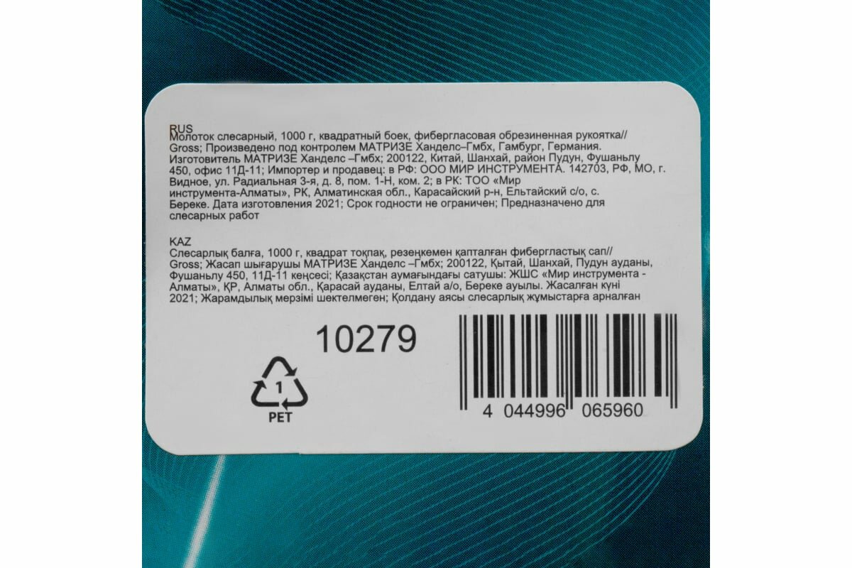 Gross Молоток слесарный, квадратный боек, фибергласовая обрезиненная рукоятка, 1 кг 10279