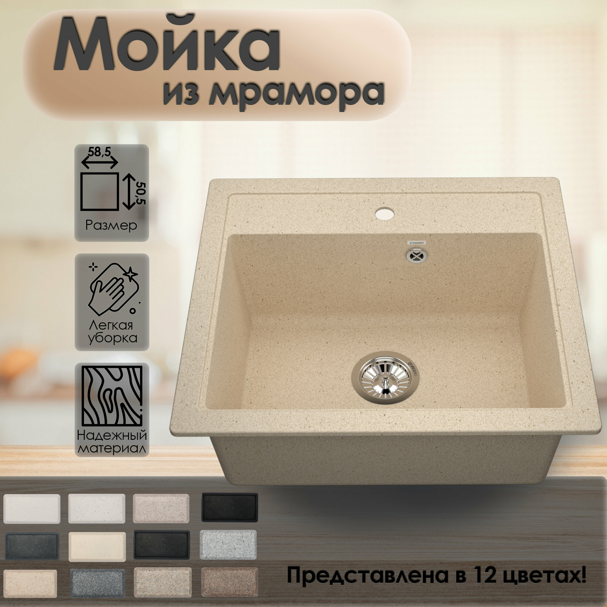 Купить Мойка для кухни VIGRO врезная из искусственного камня (58.5*50.5 см), латте
