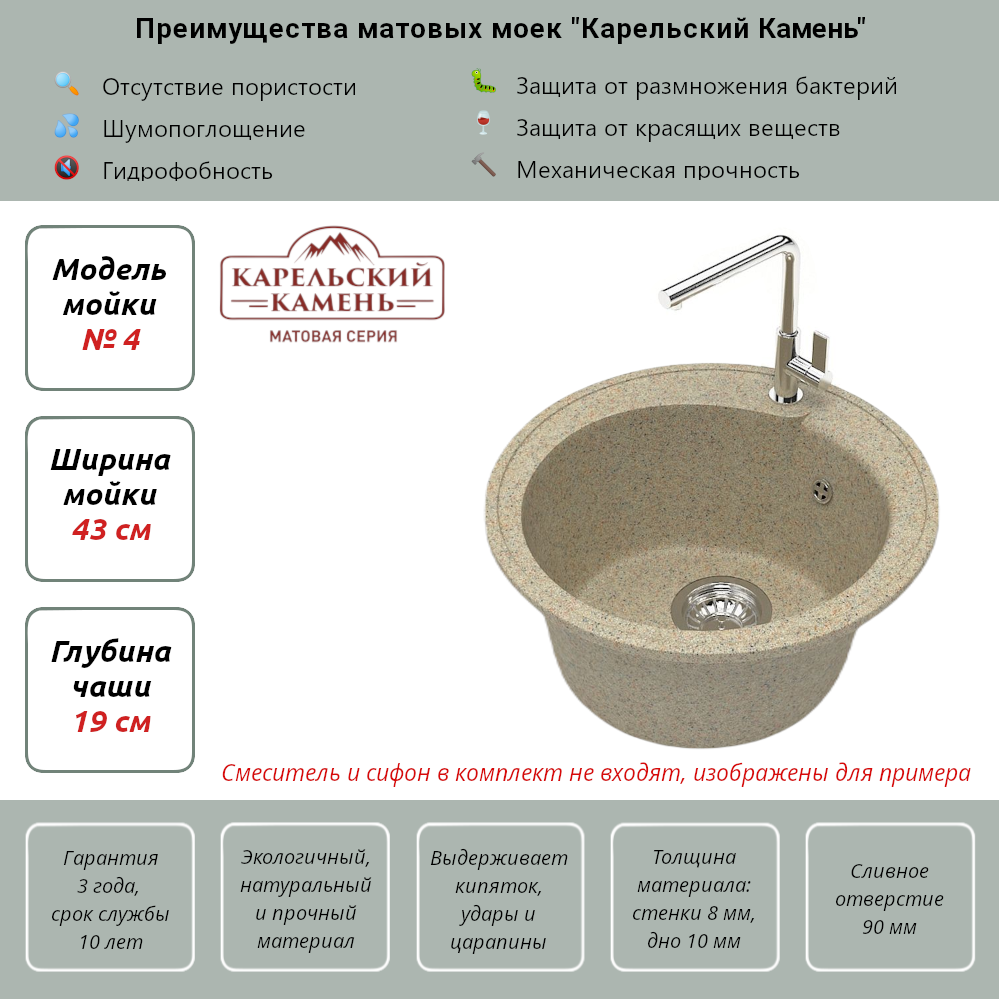 Мойка Раковина для кухни из искусственного камня матовая ТМ Карельский камень (MARRBAXX) Модель 4-Q5 Цвет песочный матовый