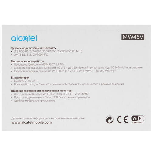 | Дополнительная информация | роутер Alcatel Link Zone MW45V, аккумуляторная батарея, кабель микро-USB, руководство пользователя, гарантийный талон; ёмкость батареи 2150 мА·ч, съёмная, литий-ионная, время работы в режиме веб-сёрфинга: до 7 часов, время работы в режиме ожидания: до 30 часов, время зарядки: 3 часа (от источника постоянного тока 5 В 1 А), 4 часа (от USB-порта ПК) |