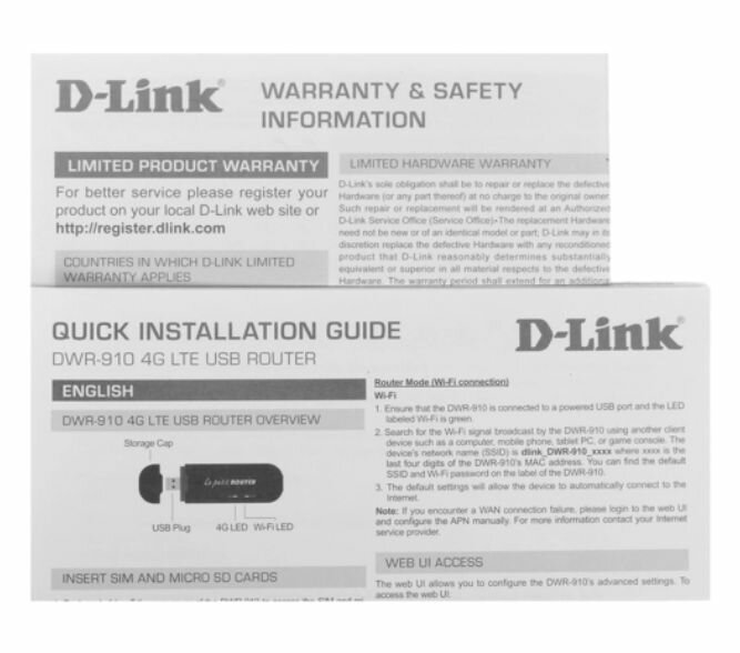 Роутер D-Link DWR-910/3GG4GE, Wireless USB LTE Router with 1 USIM/SIM and 1 microSD cards Slots802.11b/g/n compatible, 802.11n up to 75Mbps; microSD card slot; high speed USB 2.0 interface; NAT, DMZ, DHCP s