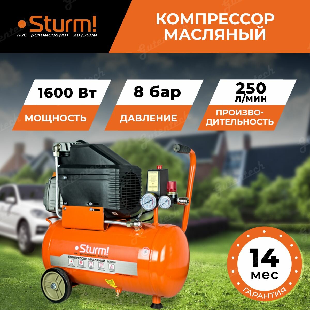 Купить Компрессор воздушный масляный Sturm! AC93166, 1,6кВт, 250л/мин, ресивер 50л, прямой привод