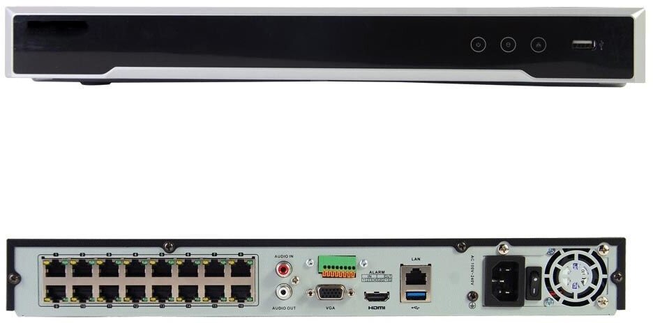 Hikvision DS-7616NI-K2 16P 16-ти канальный IP-видеорегистратор с PoE Видеовход: 16 каналов; аудиовход: двустороннее аудио 1 канал RCA; видеовыход: 1 VGA до 1080Р, 1 HDMI до 4К; аудиовыход: 1 канал RCA