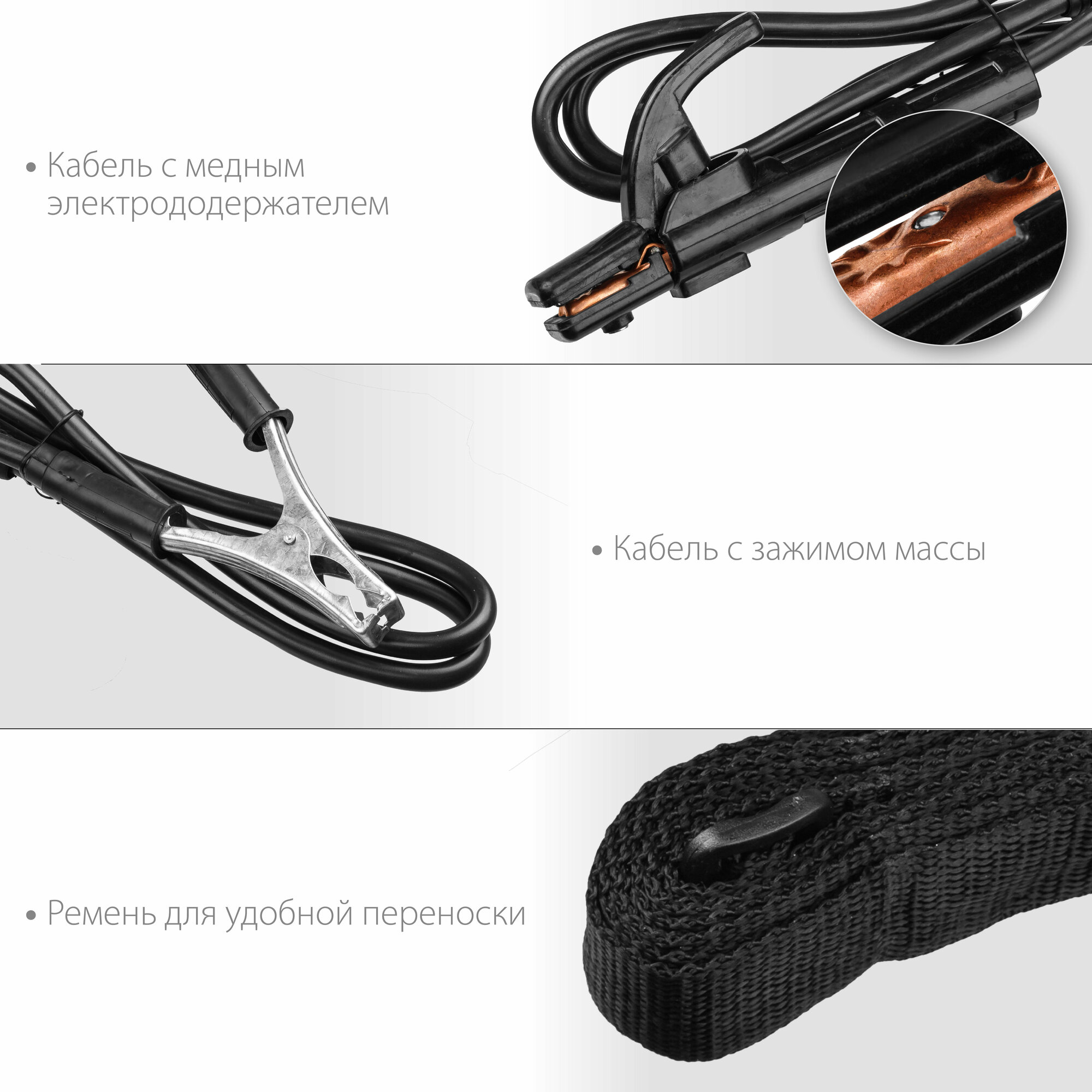| Комплектация | аппарат сварочный, кабель с электрододержателем 1.5 м, кабель с зажимом массы 1.2 м, ремень, руководство по эксплуатации |