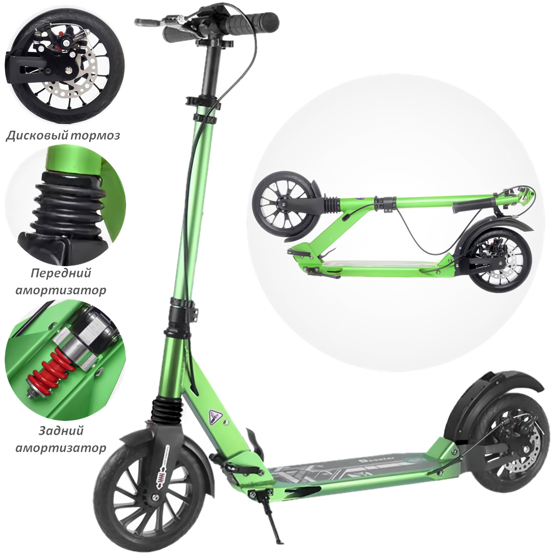 Купить Городской самокат Scooter Disk Brake 2024 с ручным дисковым тормозом и амортизаторами Зелёный металлик