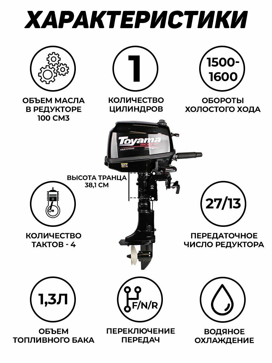 Бензиновый лодочный мотор TOYAMA F5.0BMS, 4-тактный, 5 л.с.