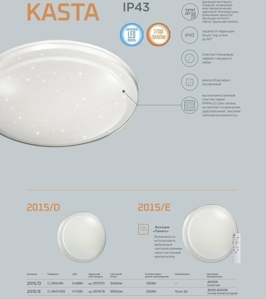 Купить Светильник настенно-потолочный сонекс KASTA (2015/E) с пультом в/з 72 Вт 220 В теплый/холодный белый свет IP43