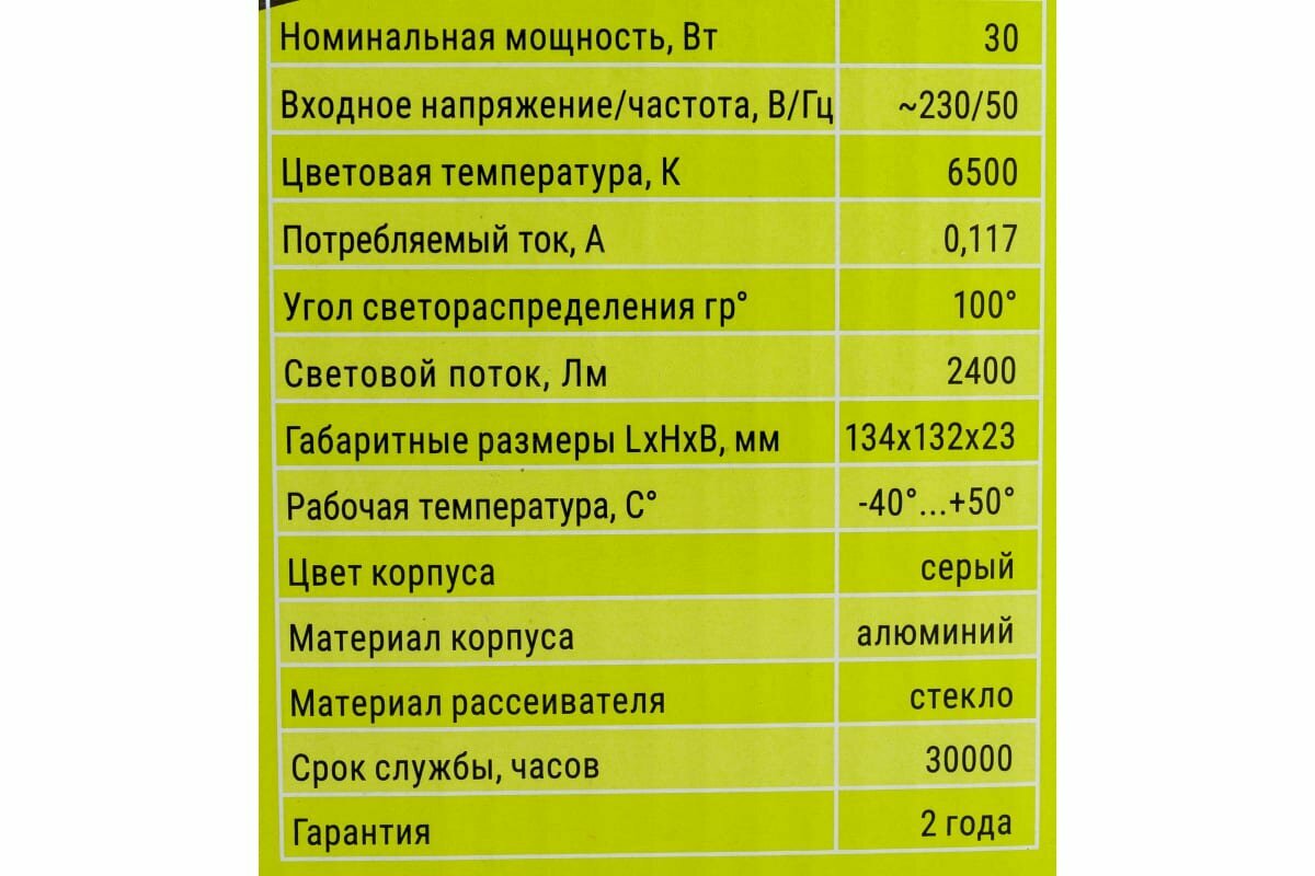 | Дополнительная информация | источник света: светодиоды SMD 2835 SANAN; угол светораспределения: 100°; коэффициент мощности: >0,9; класс энергетической эффективности: A+; климатическое исполнение: У1; рекомендуемая высота установки: 5 м; максимальная площадь проекции прожектора, подвергаемая воздействию ветра: 176 см. кв |
