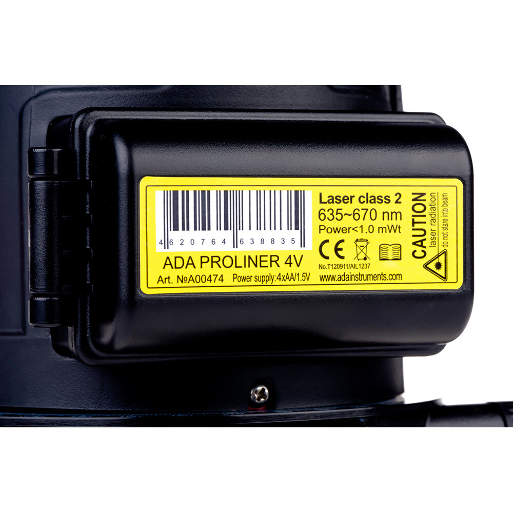 Лазерный уровень ADA PROLiner 4V (лазерный уровень, лазерные очки, магнитная мишень, винт-удлинитель 5/8'', батареи тип АА 1,5 V (4 шт.), держатель для батарей (адаптер), пластиковый кейс, инструкция)