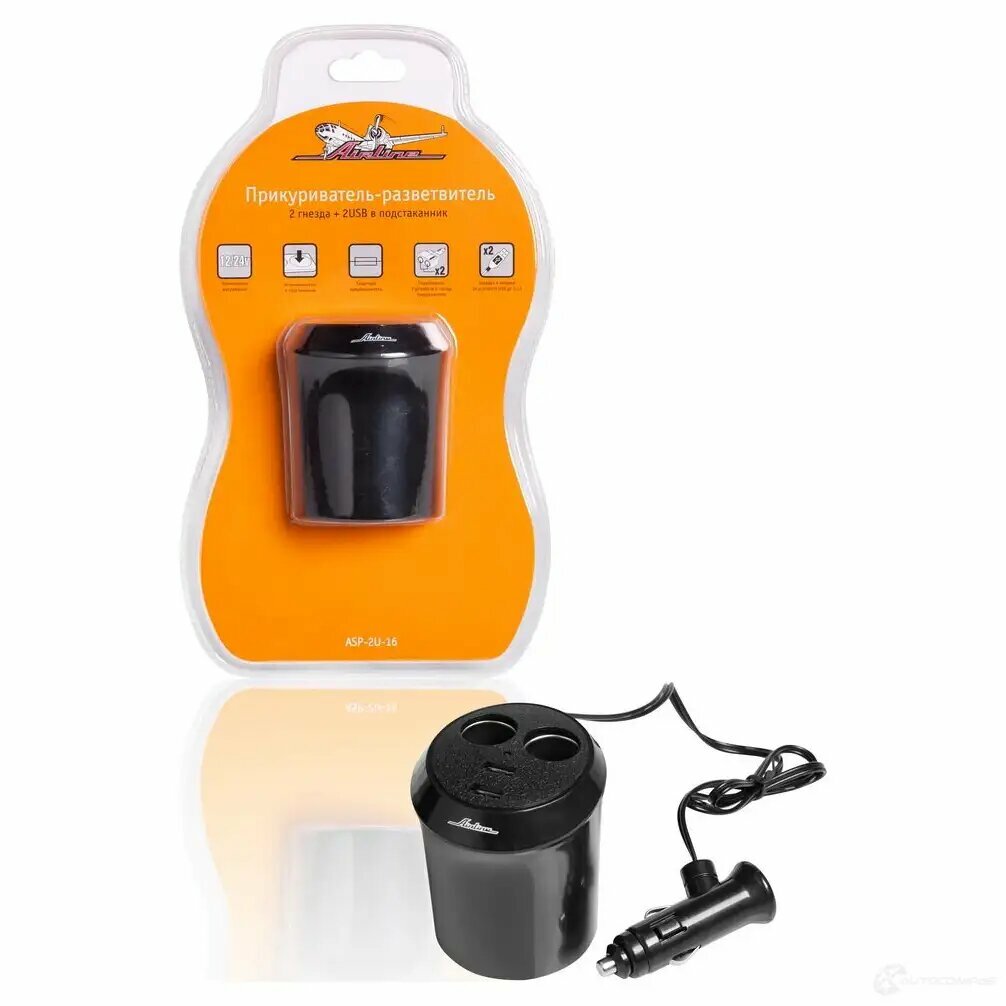 Купить Прикуриватель-Разветвитель 2 Гнезда + 2Usb В Подстаканник (Asp-2U-16) AIRLINE арт. asp-2u-16