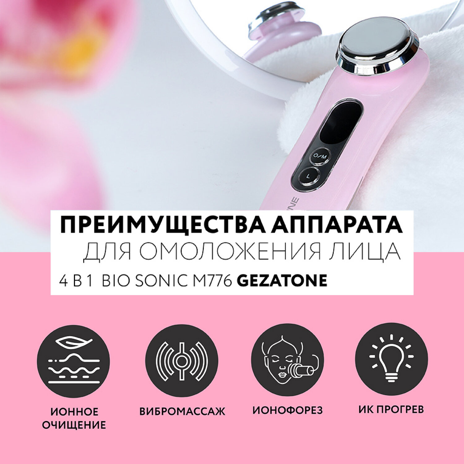 Gezatone, Аппарат для омоложения лица с функцией гальванизации и электрофореза, массажер с ИК прогревом, Bio Sonic m776
