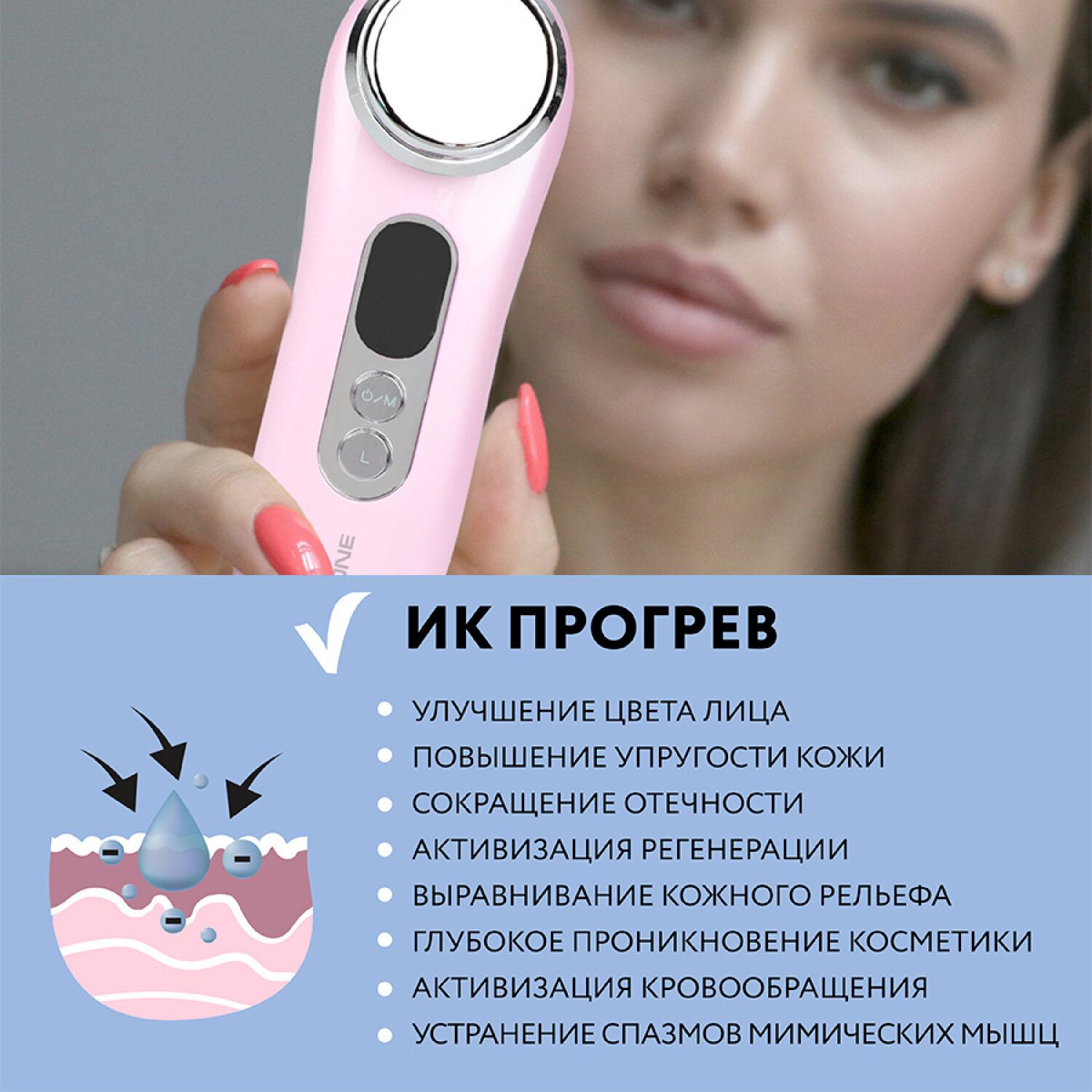 | Противопоказания | аритмии, недостаточность кровообращения свыше II Б степени; электрокардиостимулятор или другие электронные имплантаты; онкологические заболевания; период беременности и лактации; нарушение целостности кожных покровов: ожоги, порезы, раны, ссадины, трофические язвы; хронические дерматиты и дерматозы в стадии обострения, аллергическая реакция на коже в месте воздействия прибора; острые воспалительные и гнойные процессы, акне в стадии обострения; нарушения кожной чувствительности (болевой и температурной); психические расстройства, эпилепсия; сахарный диабет; наличие имплантатов, располагающихся под кожей или в мышцах в зоне воздействия прибором (золотые нити, металлические скобки); наличие подкожных силиконовых имплантов; не рекомендуется проводить процедуры в течение действия инъекций ботокса, а также во время курса инвазивных косметических процедур; острые инфекционные и вирусные заболевания, грипп, орви, повышенная температура. обострение хронических воспалительных процессов |