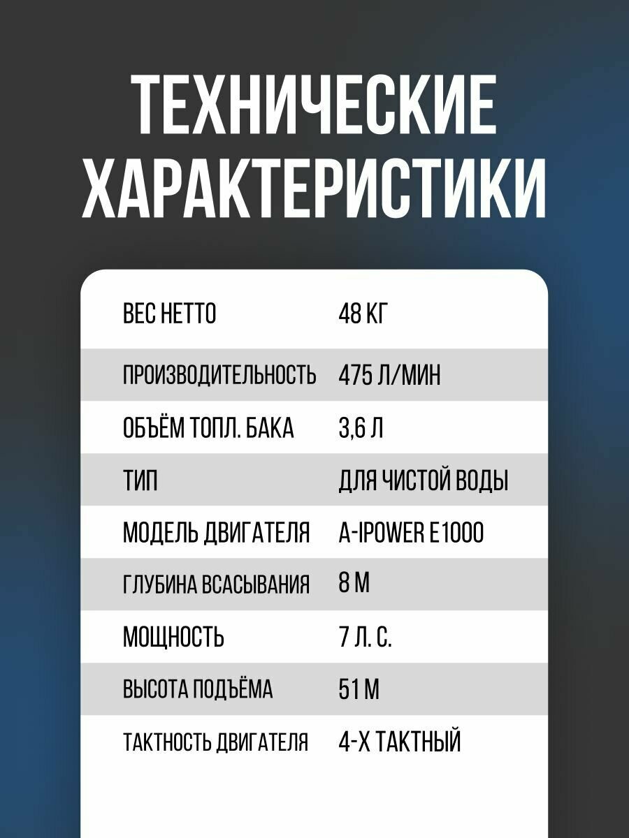 СохранитьМотопомпа бензиновая A-iPower AWP50H (5150 Вт,475 л/мин, высота подъема 51 м,24,7 кг) интересное: