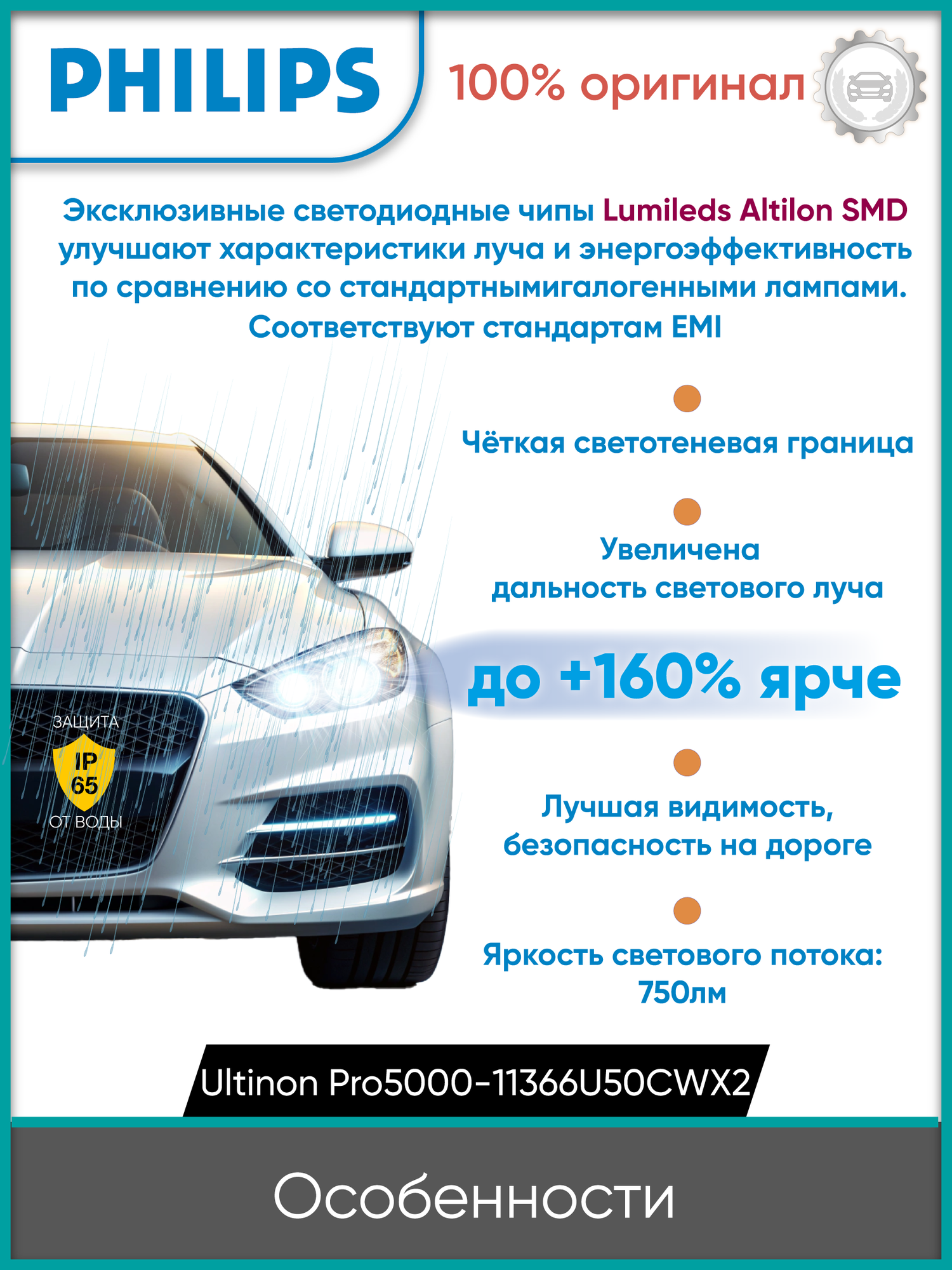 Лампа автомобильная светодиодная Philips Ultinon Pro5000 HL 11366U50CWX2 H8/H11/H16 12V 13.2W 2 шт.
