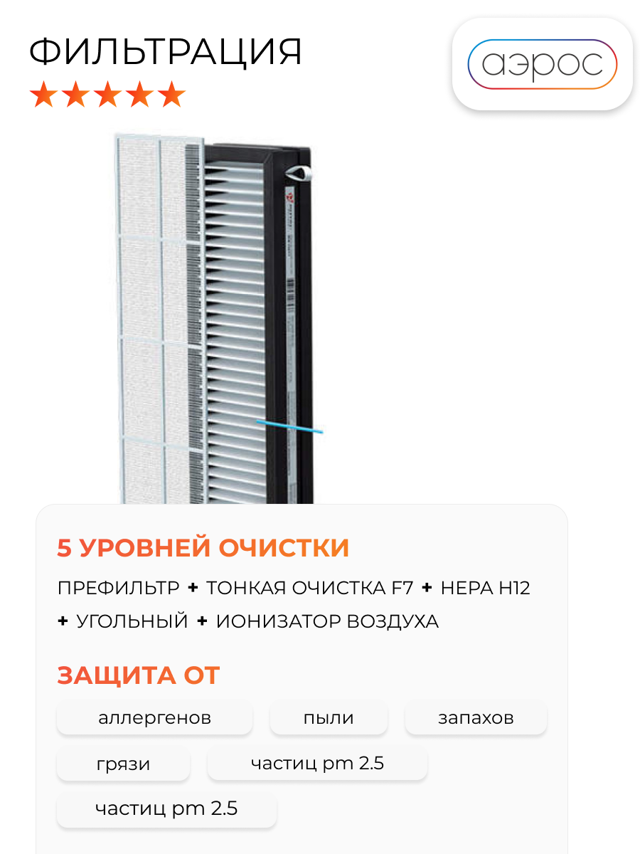 | Дополнительная информация | сетчатый фильтр предварительной очистки, фильтр тонкой очистки F7, угольный фильтр; HEPA-фильтр сверхтонкой очистки H12, температура эксплуатации: -40 / +50 °С, 6 режимов работы, 6 скоростей вентилятора, встроенный датчик загрязнения воздуха РМ2.5; класс электрозащиты: II класс |