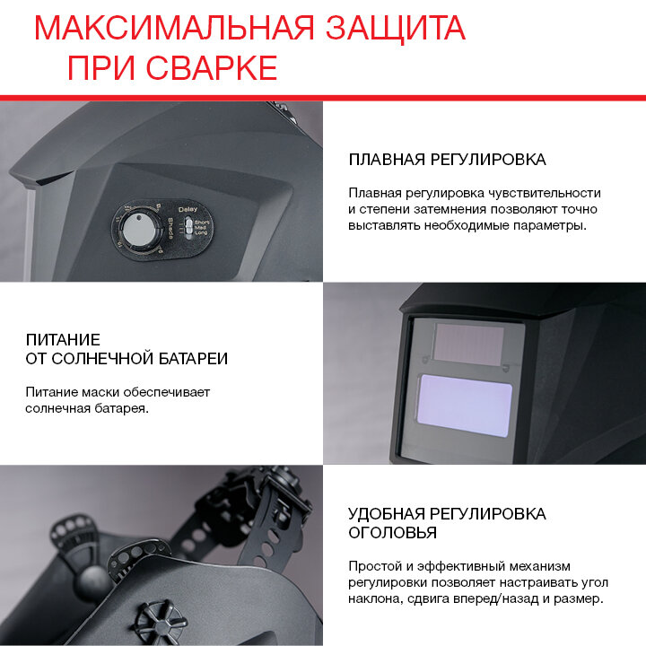 | Плюсы: | Качественный пластик, не нужна замена батареек, удобное крепление, хорошая чувствительность, возможность использовать настройку сварка-шлифовка, настройка чувствительности, настройка задержки затемнения. |
