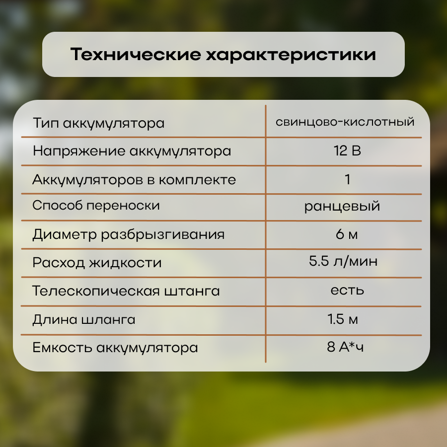 | Дополнительная информация | в комплекте: аккумулятор, зарядное устройство, распылительная штанга со шлангом и рукояткой, ранцевый ремень, фильтр, сменные распылительные насадки - 3 шт., уплотнительное кольцо - 3 шт., руководство по эксплуатации |