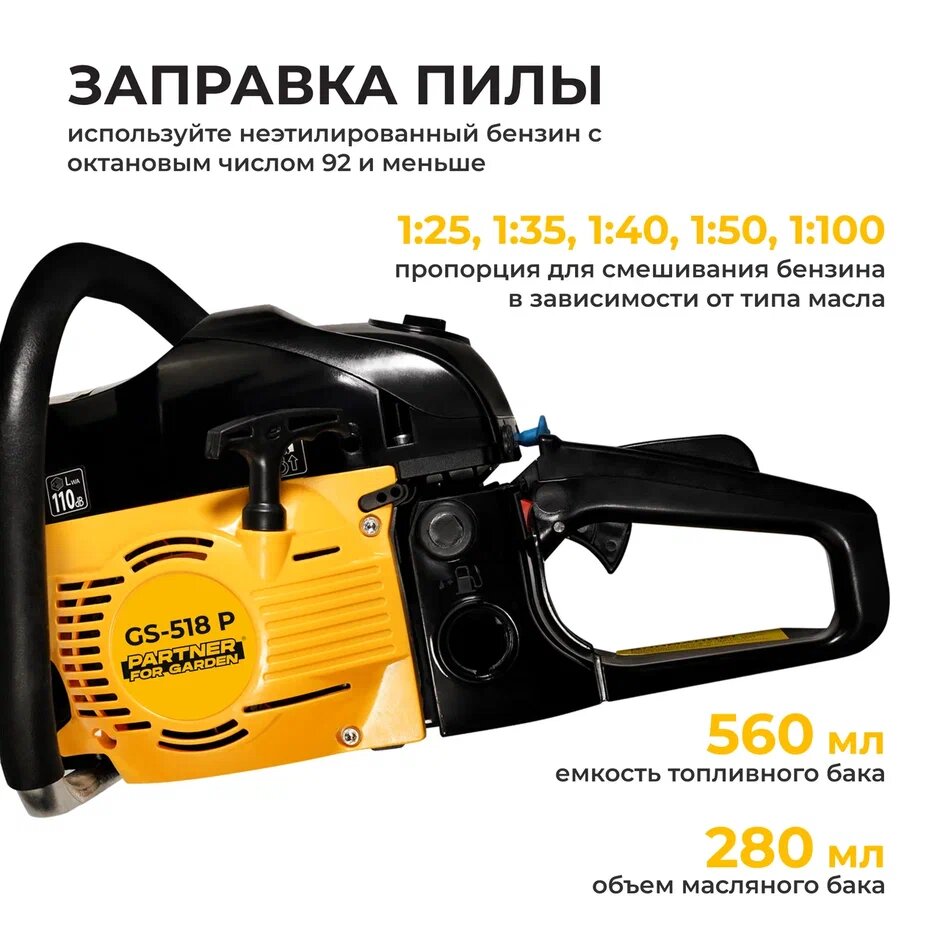 Бензопила цепная Partner for Garden GS 518 бензиновая 3,5 л.с, мощность 2,4 кВт, длина шины 18" - 45 см