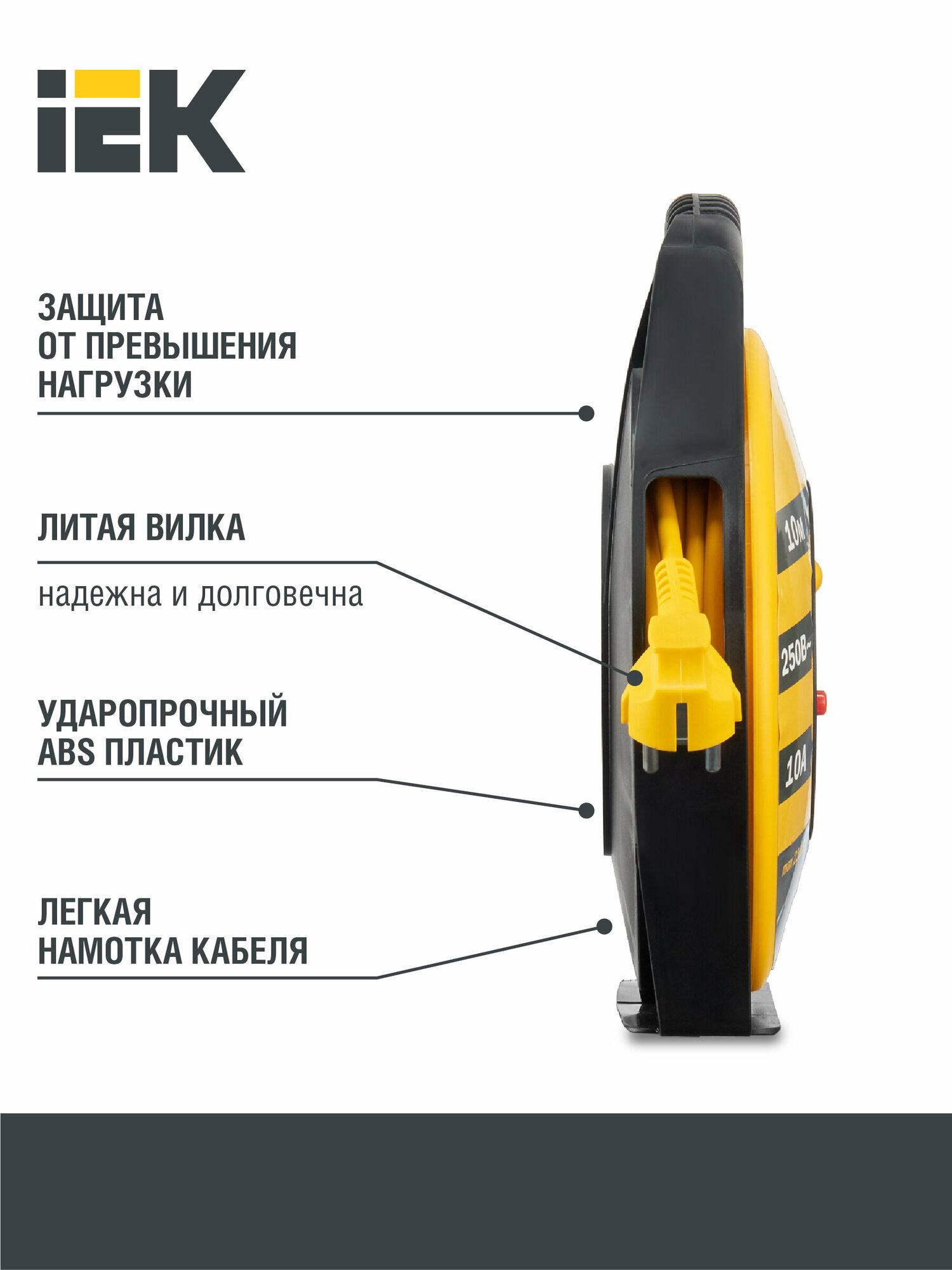 Удлинитель на катушке IEK Industrial УК10, 4 розетки, с т/з, с заземлением, 3 x 1 мм², 10 м