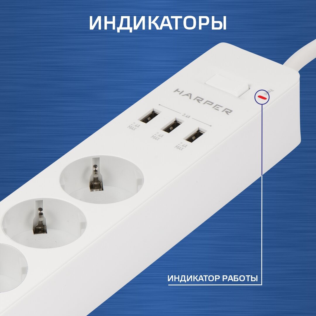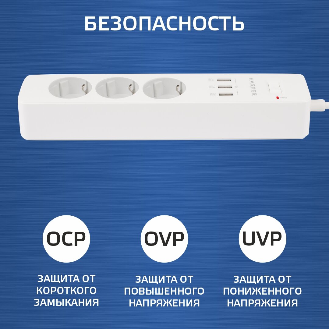Harper Сетевой фильтр с USB зарядкой UCH-325 White (3 роз.,3м., 3xUSB., (3680W)16А) (H00003008) интересное: