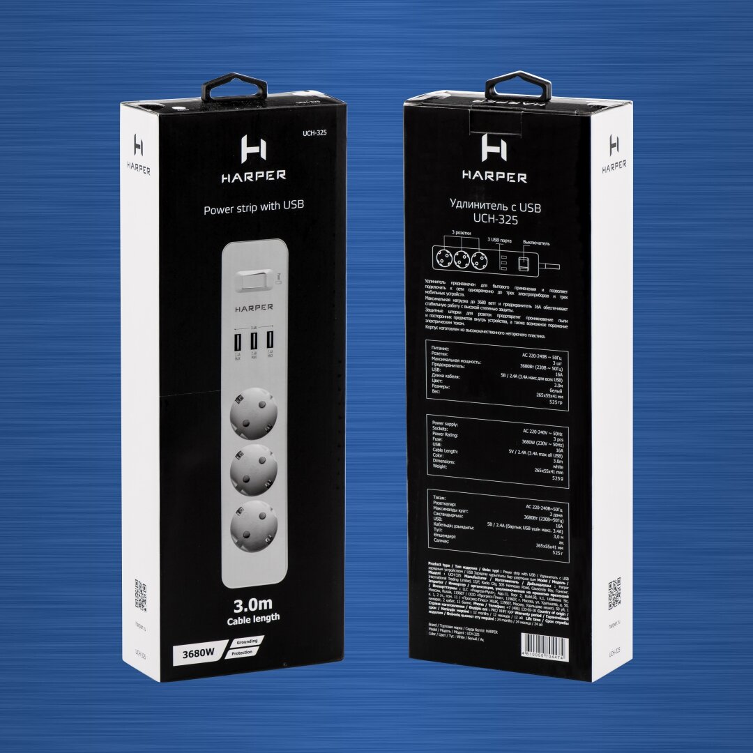 Купить Harper Сетевой фильтр с USB зарядкой UCH-325 White (3 роз.,3м., 3xUSB., (3680W)16А) (H00003008)