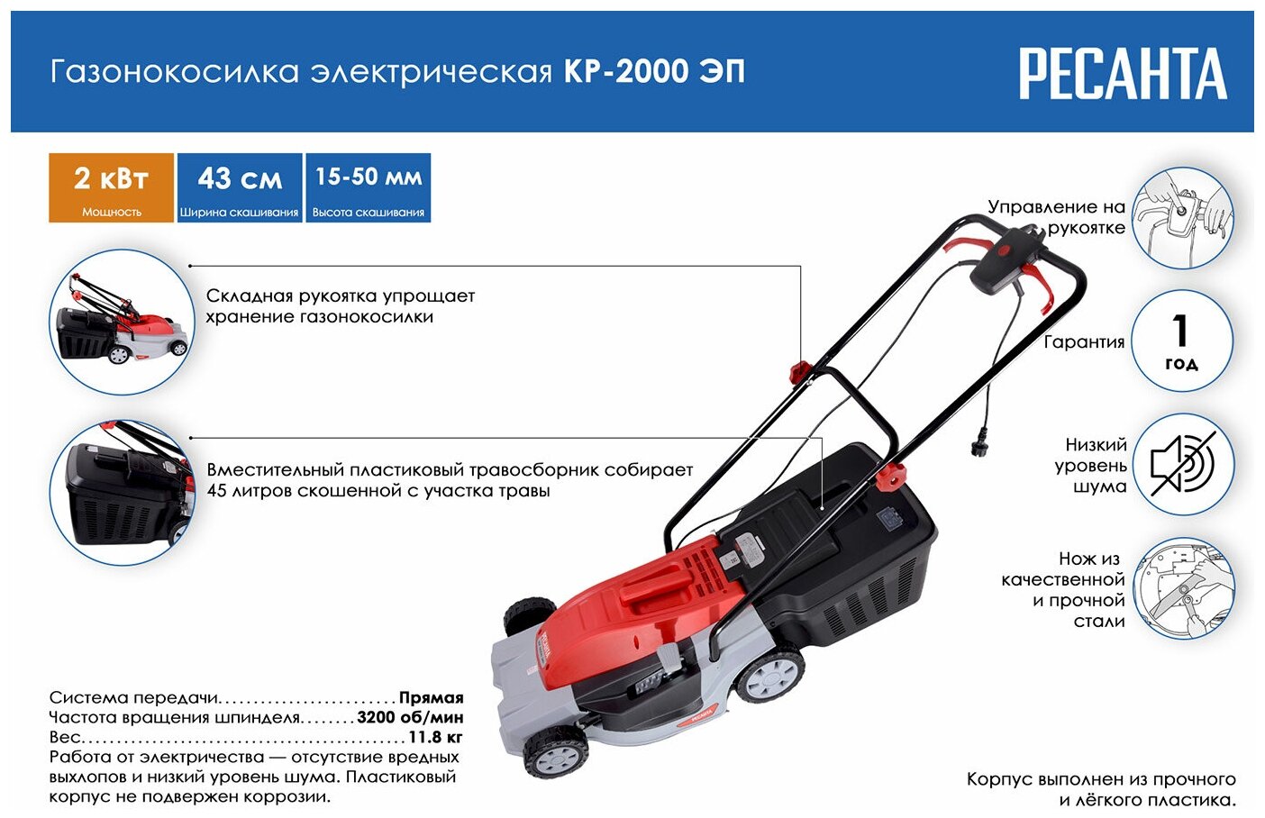 Электрическая газонокосилка РЕСАНТА КР-2000 ЭП, 2000 Вт, 43 см