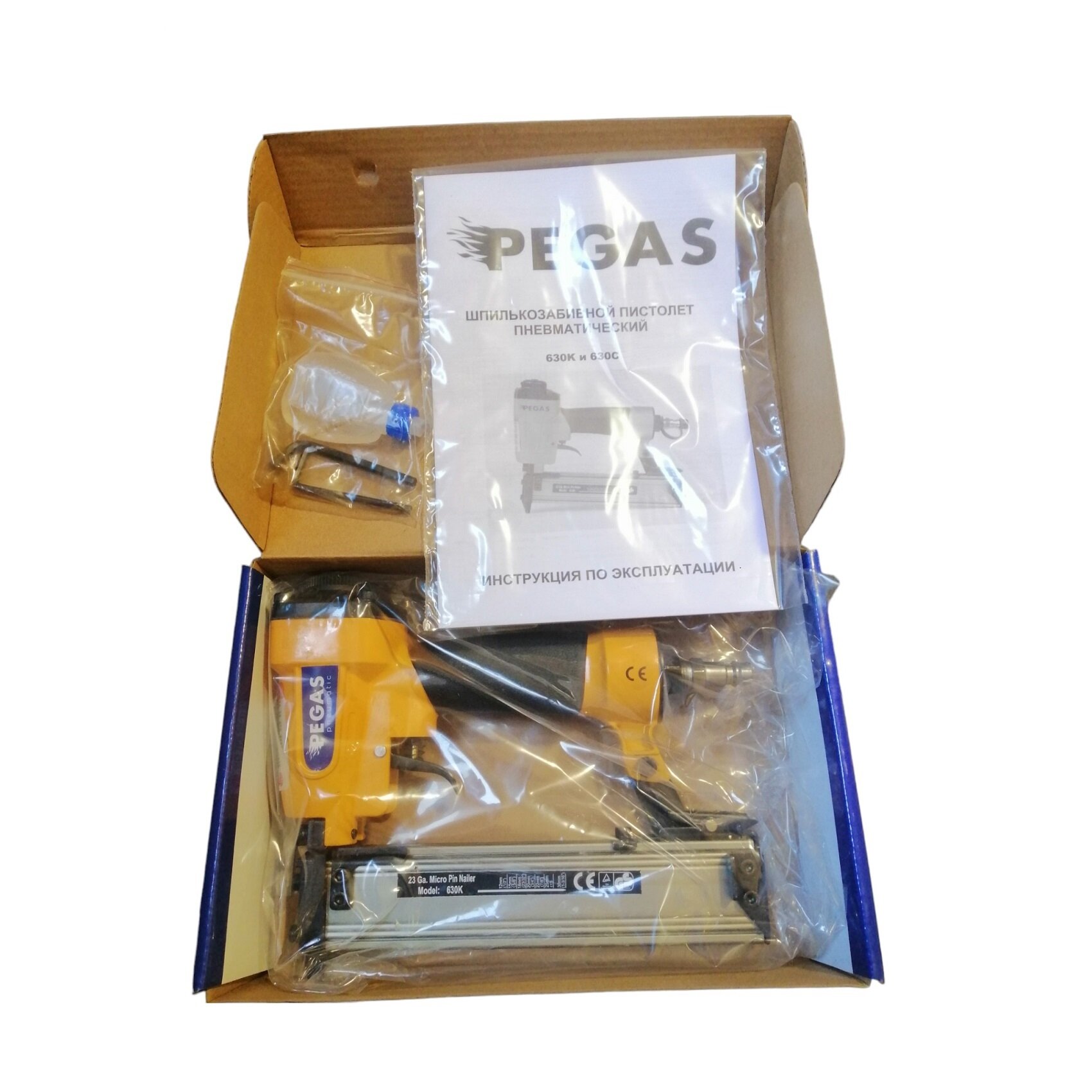 | Комплектация | пистолет Pegas 630K, смазка для пневмоинструмента, 2 ключа, руководство по эксплуатации, коробка |