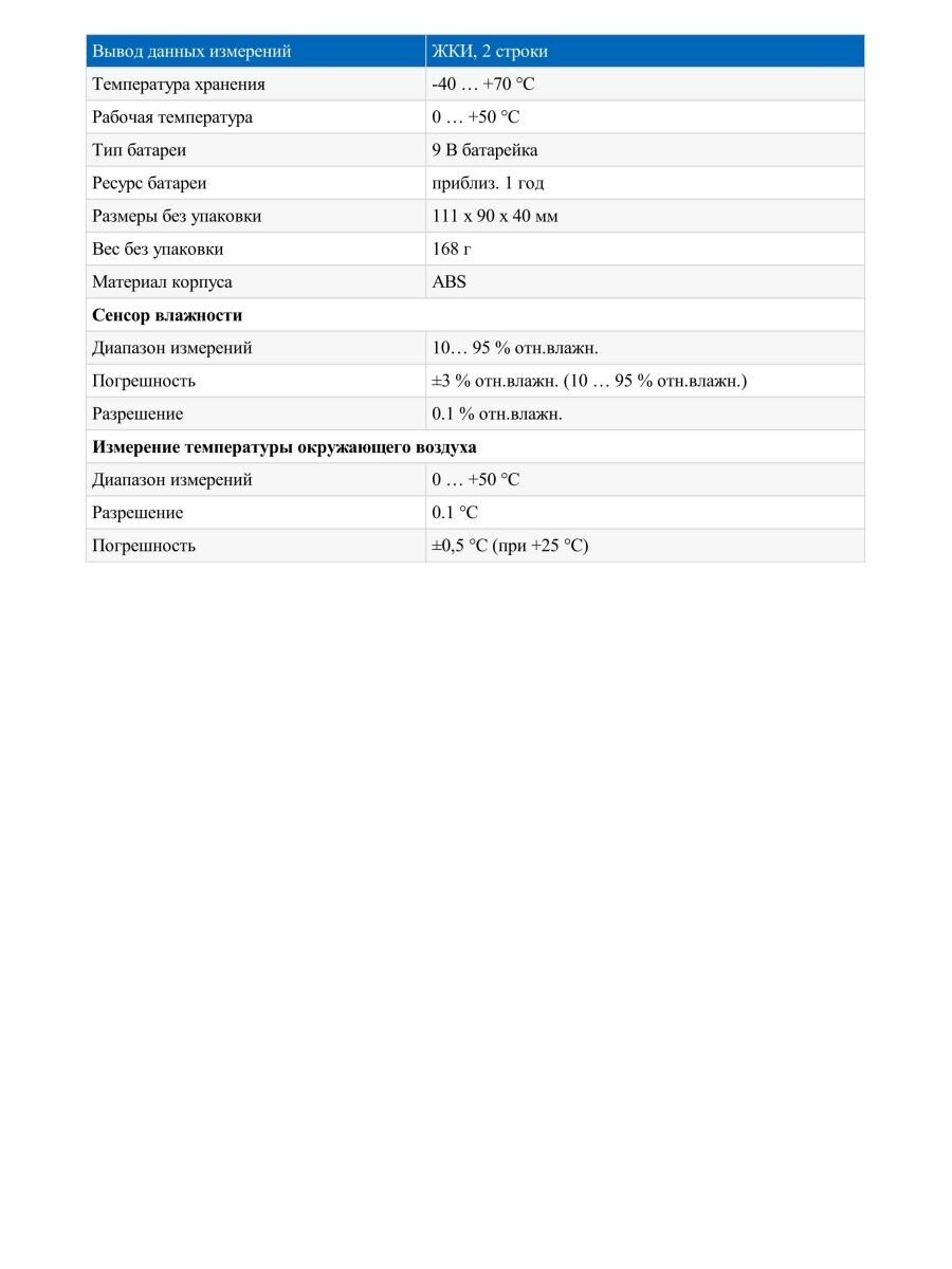 | Минимальная измеряемая влажность (воздух) | 10 % |