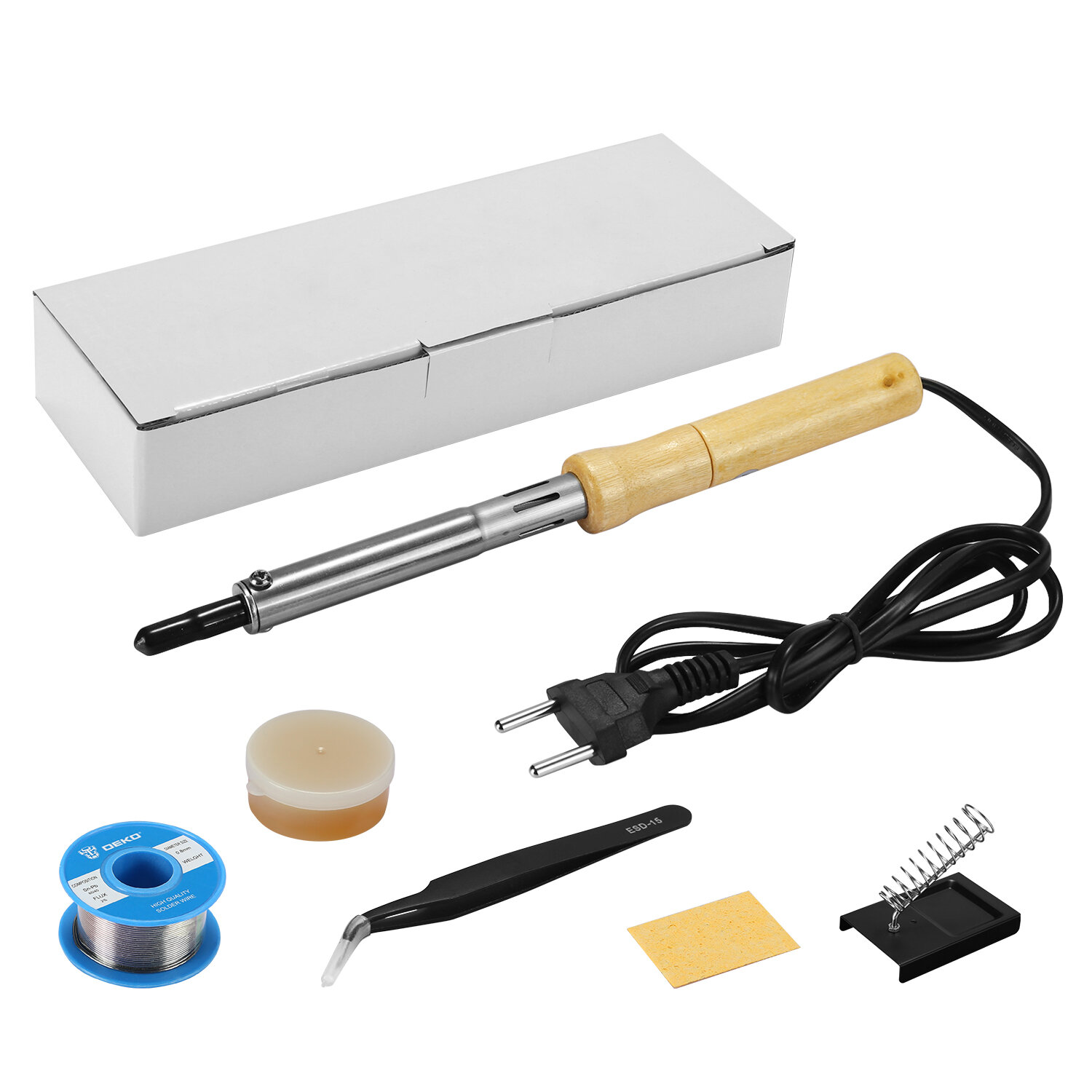 | Комплектация | паяльник 80 Вт, 220 В (1 шт.), подставка для паяльника (1 шт.), губка для очистки паяльного жала (1 шт.), пинцет (1 шт.), припой на катушке, канифоль (1 упак.) |