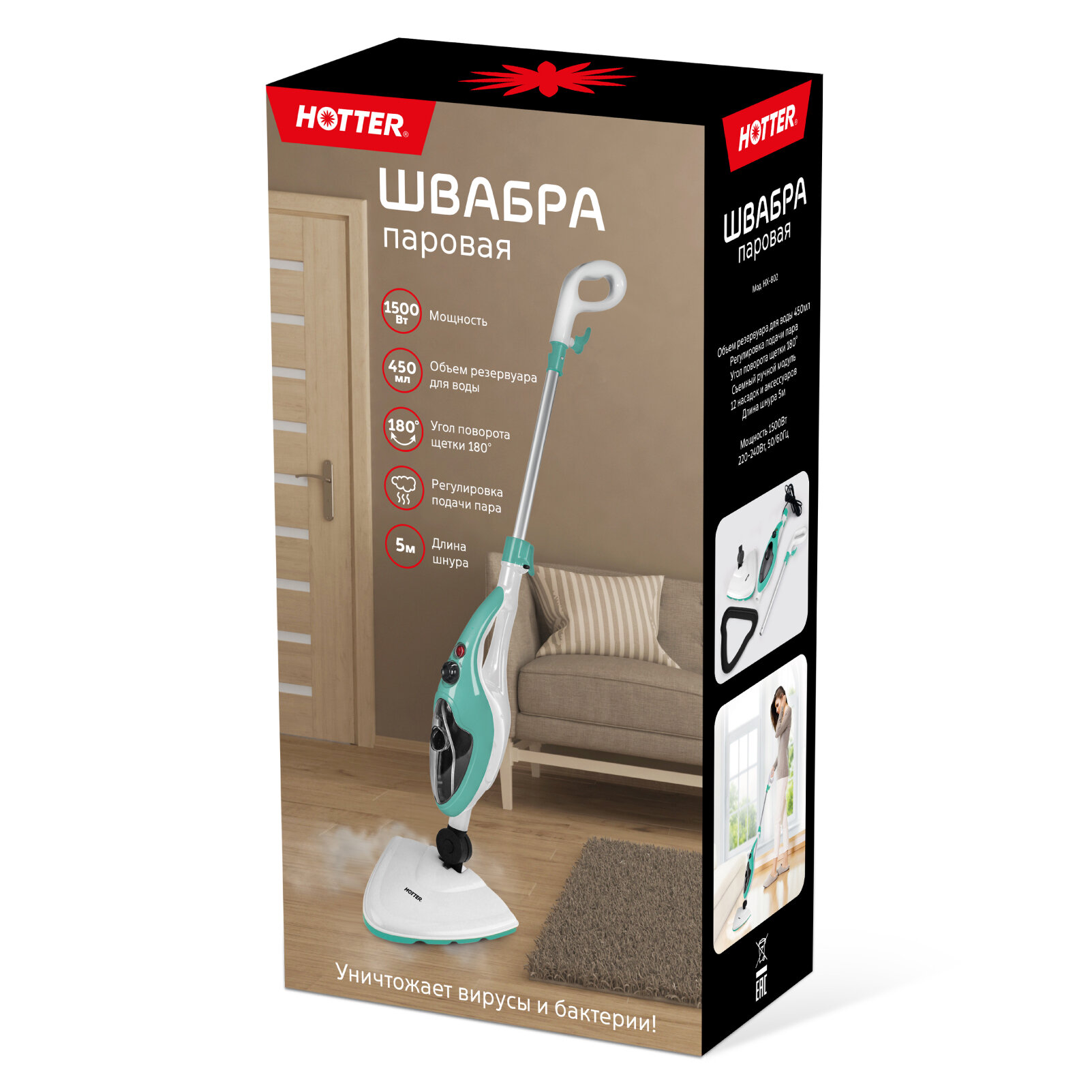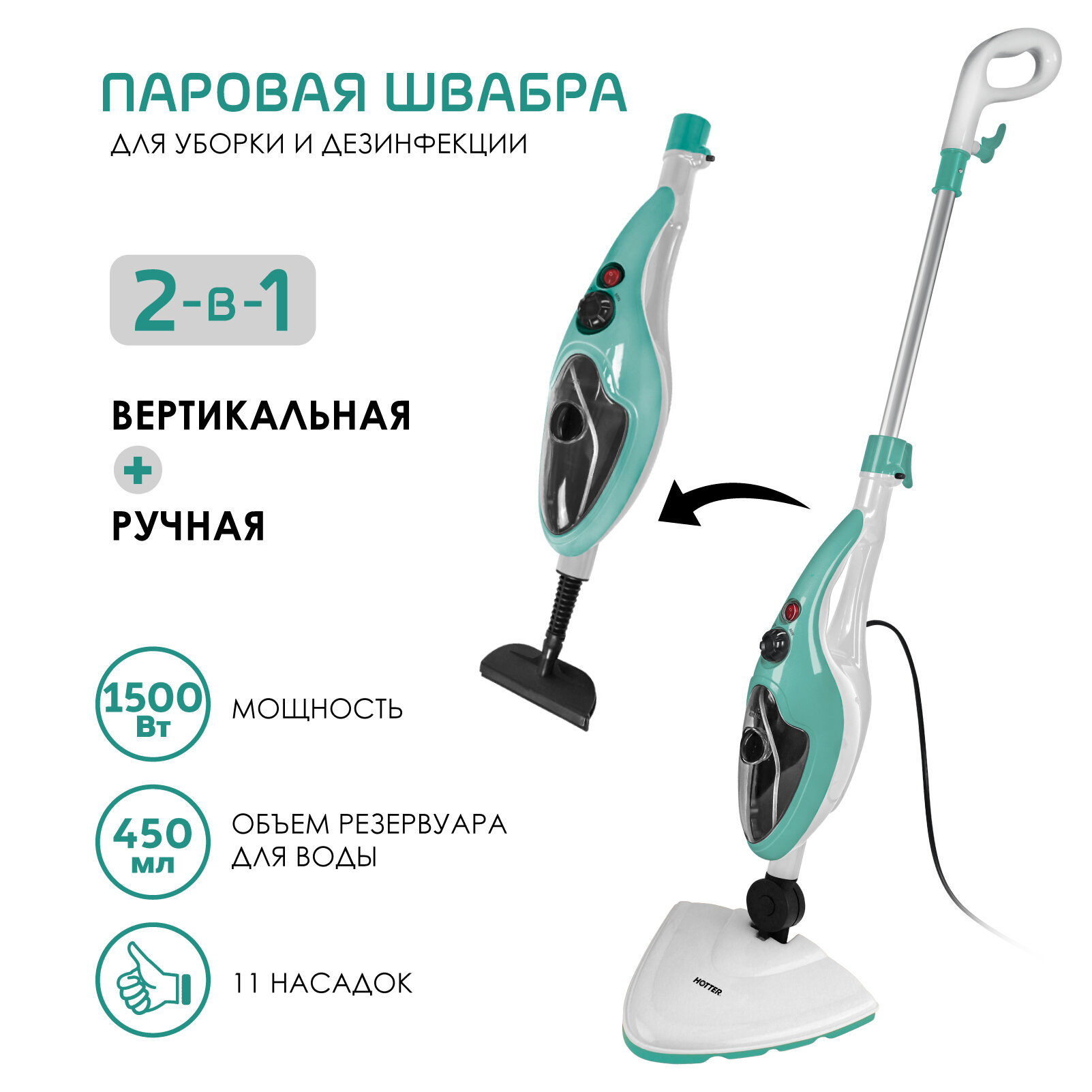 Швабра HOTTER HX-802 паровая с 12 насадками, вертикальной парковкой, 3 Бар, 1500Вт, объем резервуара 450 мл интересное:
