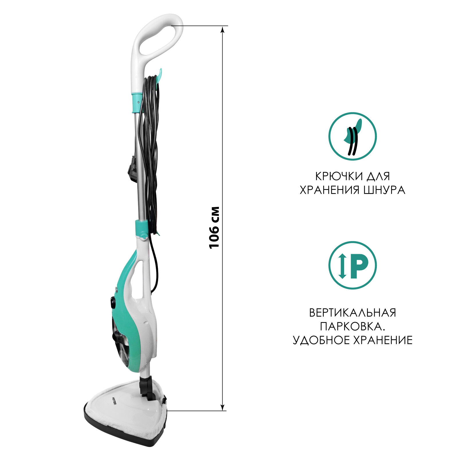 Людям высокого роста будет неудобно, так как длина ручки небольшая. У меня рост 165, мне подошла, но можно было бы ещё см 10 для полного удобства накинуть. И мощность парового удара хотелось бы больше. Я ожидала от этих параметров более сильный пар.