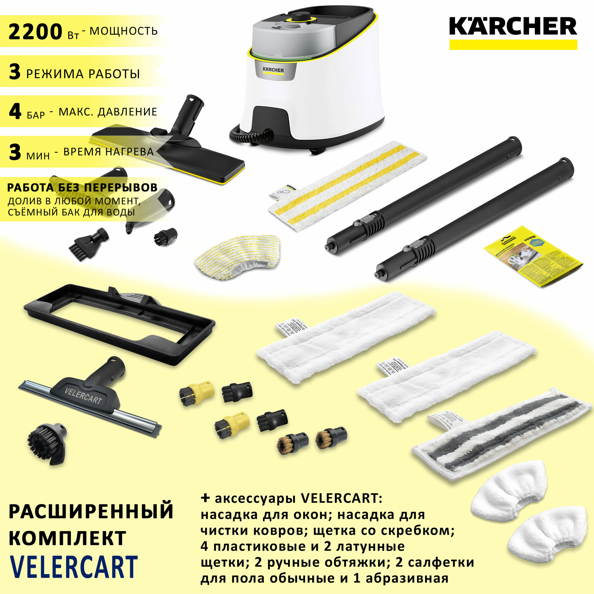 Пароочиститель Karcher SC 4 Delux EasyFix, белый + аксессуары VELERCART: насадки для окон и для чистки ковра, 2 салфетки для пола из микрофибры и 1 абразивная, 2 ручные обтяжки, 4 пластиковые щёточки и 2 латунные, щетка со скребком, мощное сопло