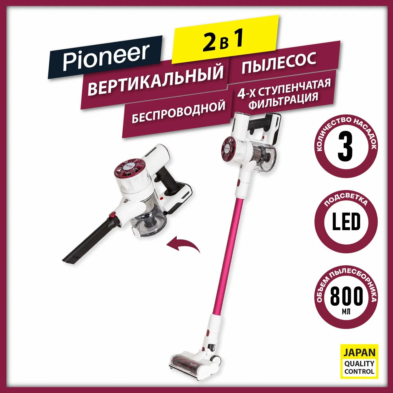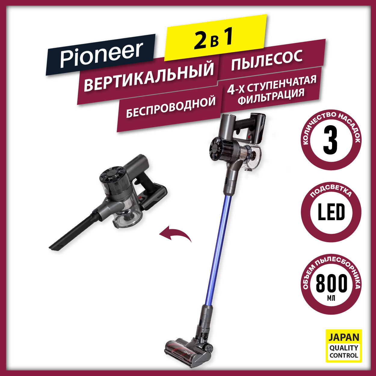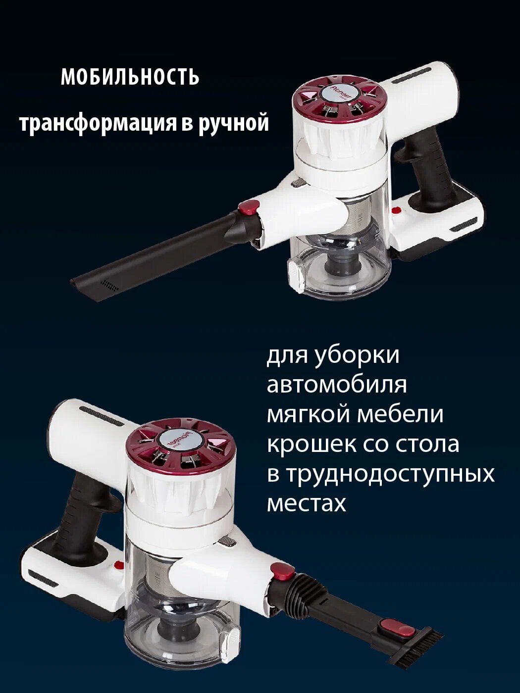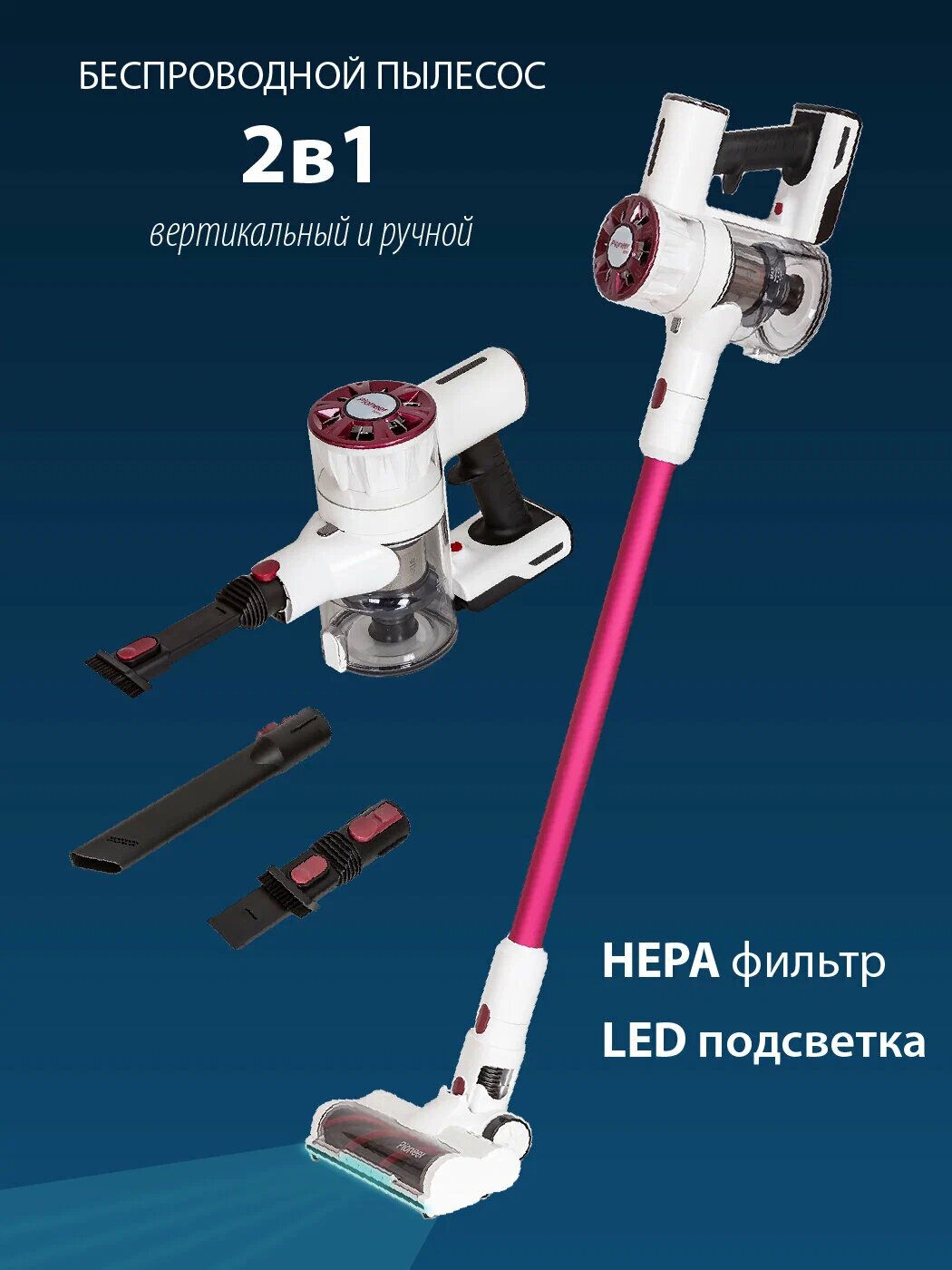 Беспроводной вертикальный пылесос циклонного типа 2 в 1 Pioneer VC455S Twilight с 3 насадками и моющимся HEPA-фильтром, 200 Вт интересное:
