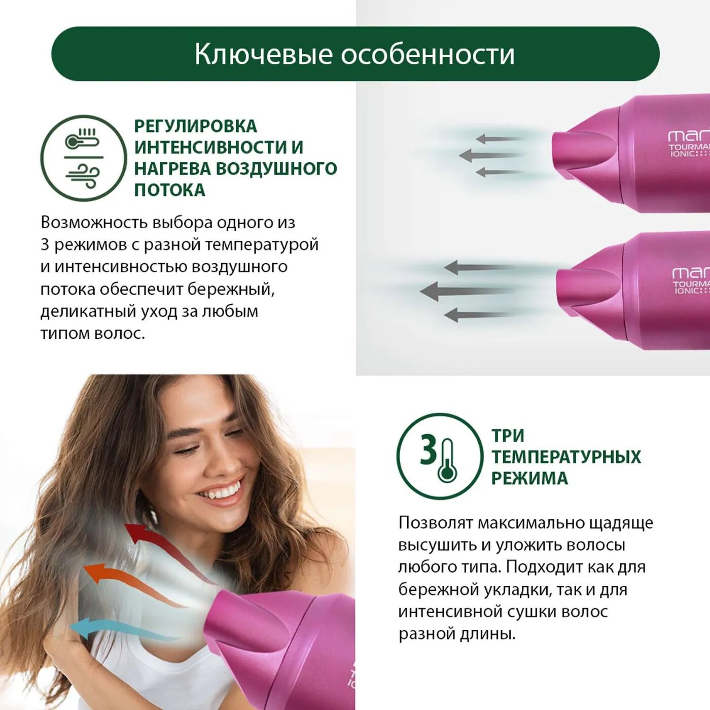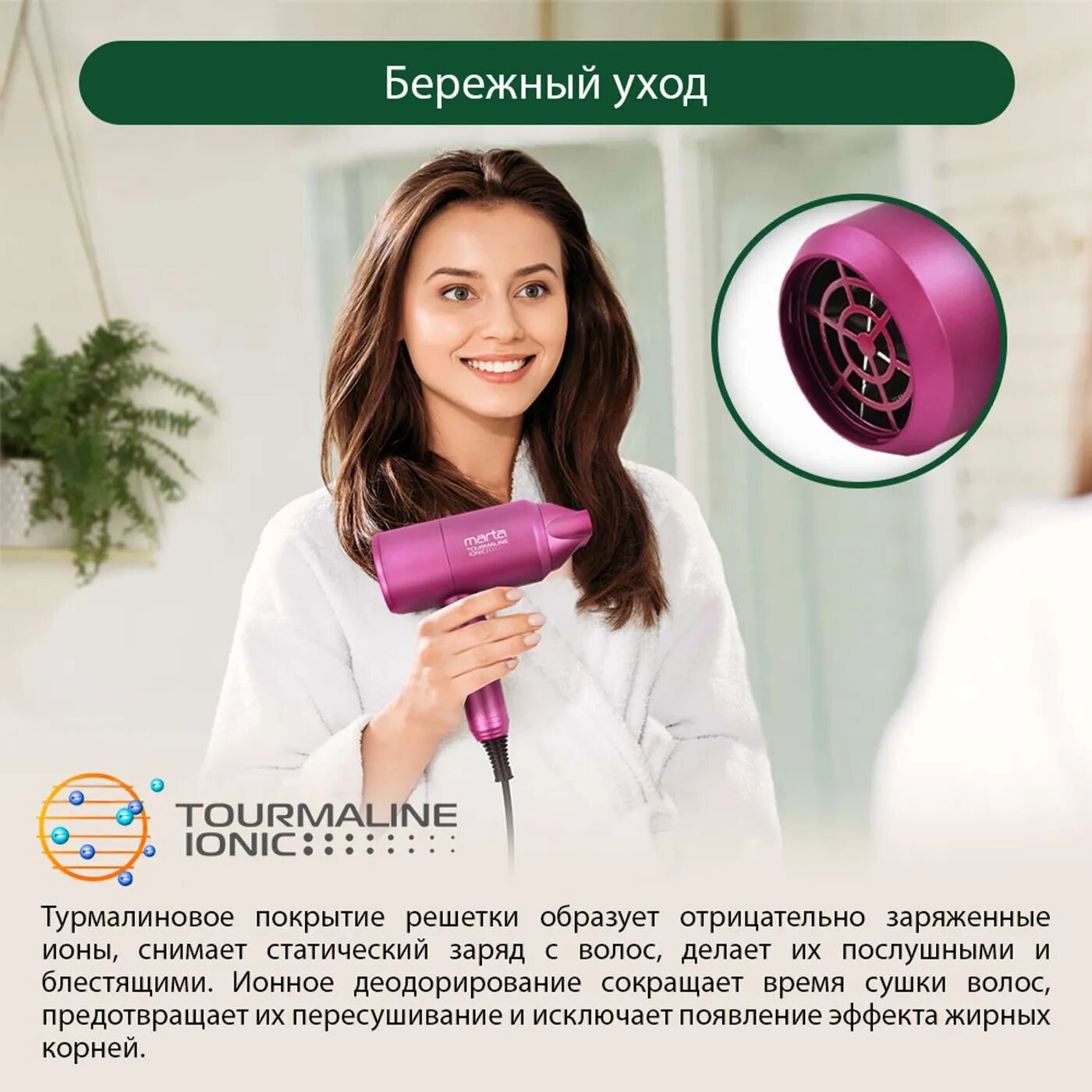 Фен MARTA MT-1268 яркая фуксия Технология tourmaline ionic интересное:
