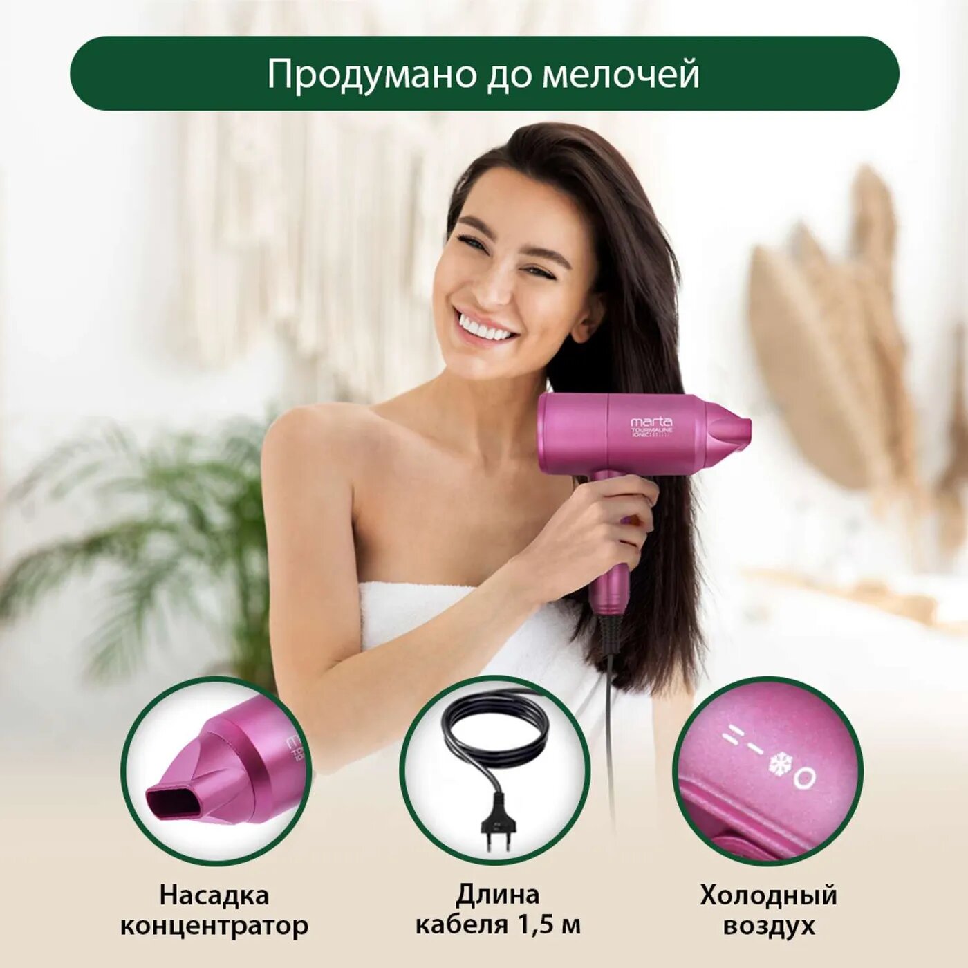 Купить Фен MARTA MT-1268 яркая фуксия Технология tourmaline ionic