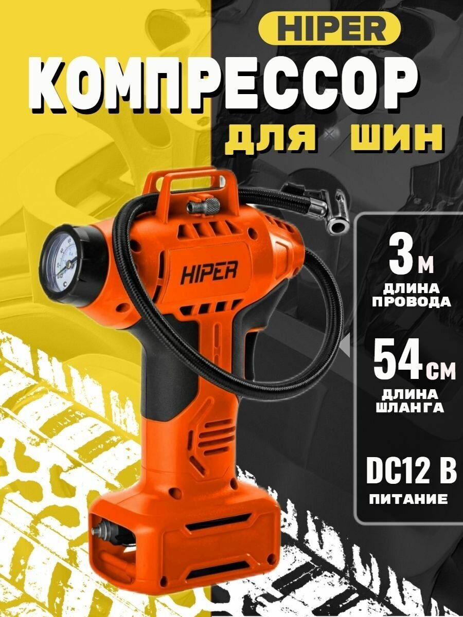 Компрессор автомобильный аналоговый HIPER H-AC12-02 / 160 PSI / 1100 Кпа / 11 Атм / 3 м / оранжево-черный