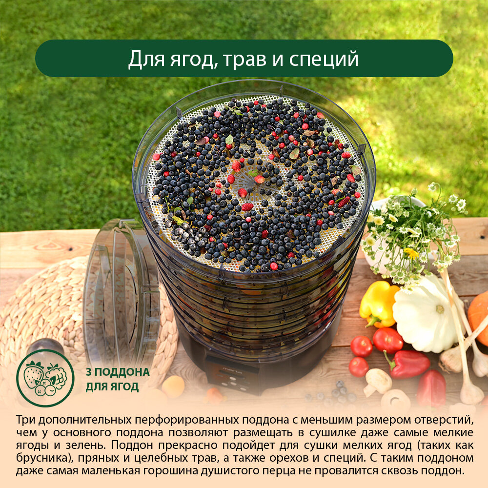 | Отзыв: | Сушилка вместительная, у нее 8 основных поддонов и по три дополнительных, для сушки ягод и приготовления пастилы. Так что за раз сразу много помещается. Управление электронное, температура поддерживается автоматически в заданном режиме. Есть ещё таймер, можно выставлять нужное время сушки. Сушит равномерно, мощность сушилки довольно высокая. |