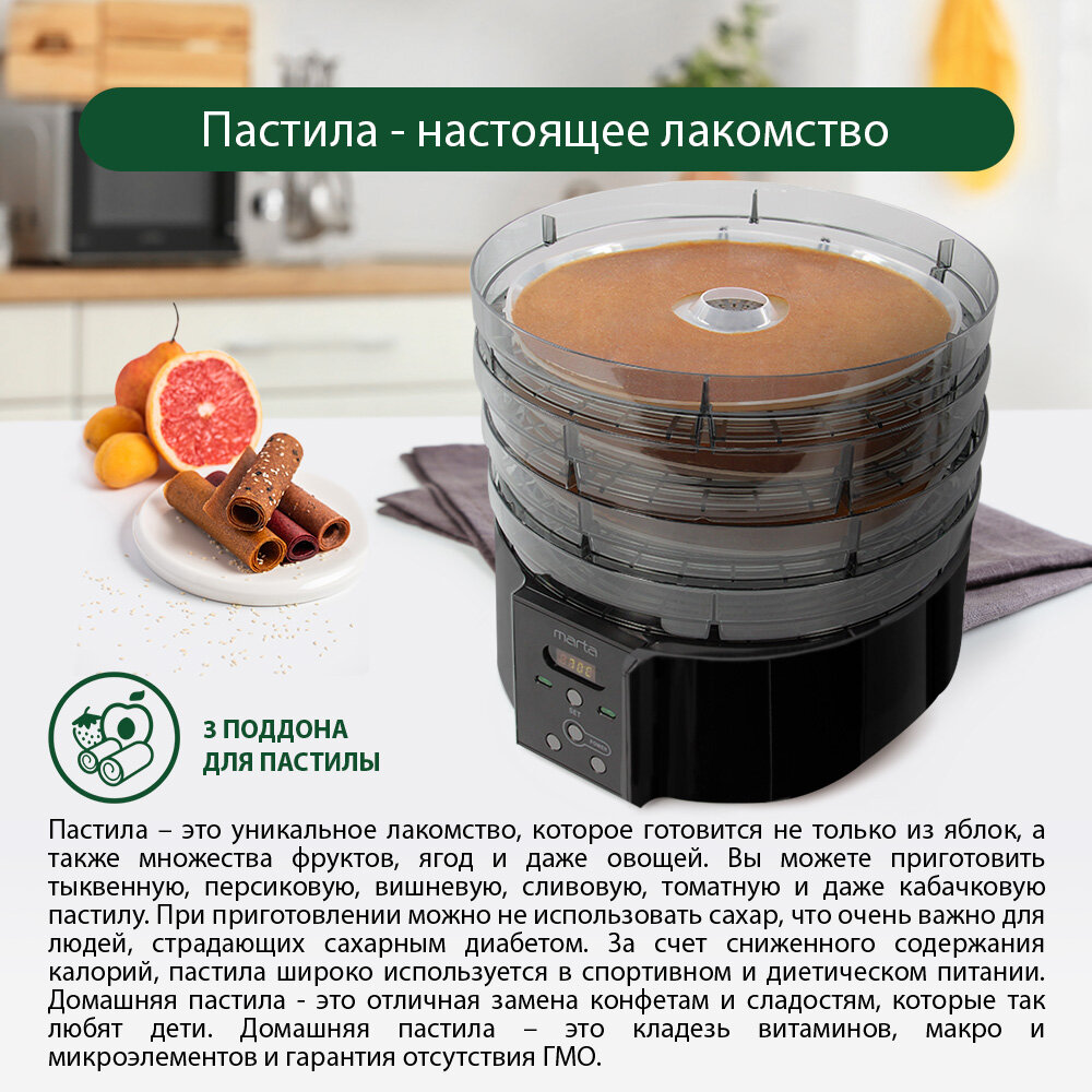 MARTA MT-FD1886D 14 поддонов-8+3 для пастилы+3 для ягод черный жемчуг сушилка д/фруктов,овощей