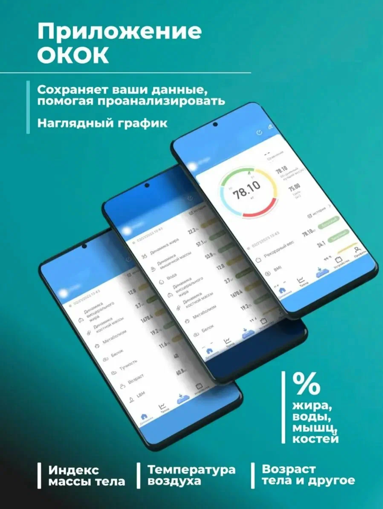 | Дополнительные функции | измерение температуры воздуха / определение доли костной ткани / определение доли мышечной ткани / память / расчет ИМТ (BMI) |