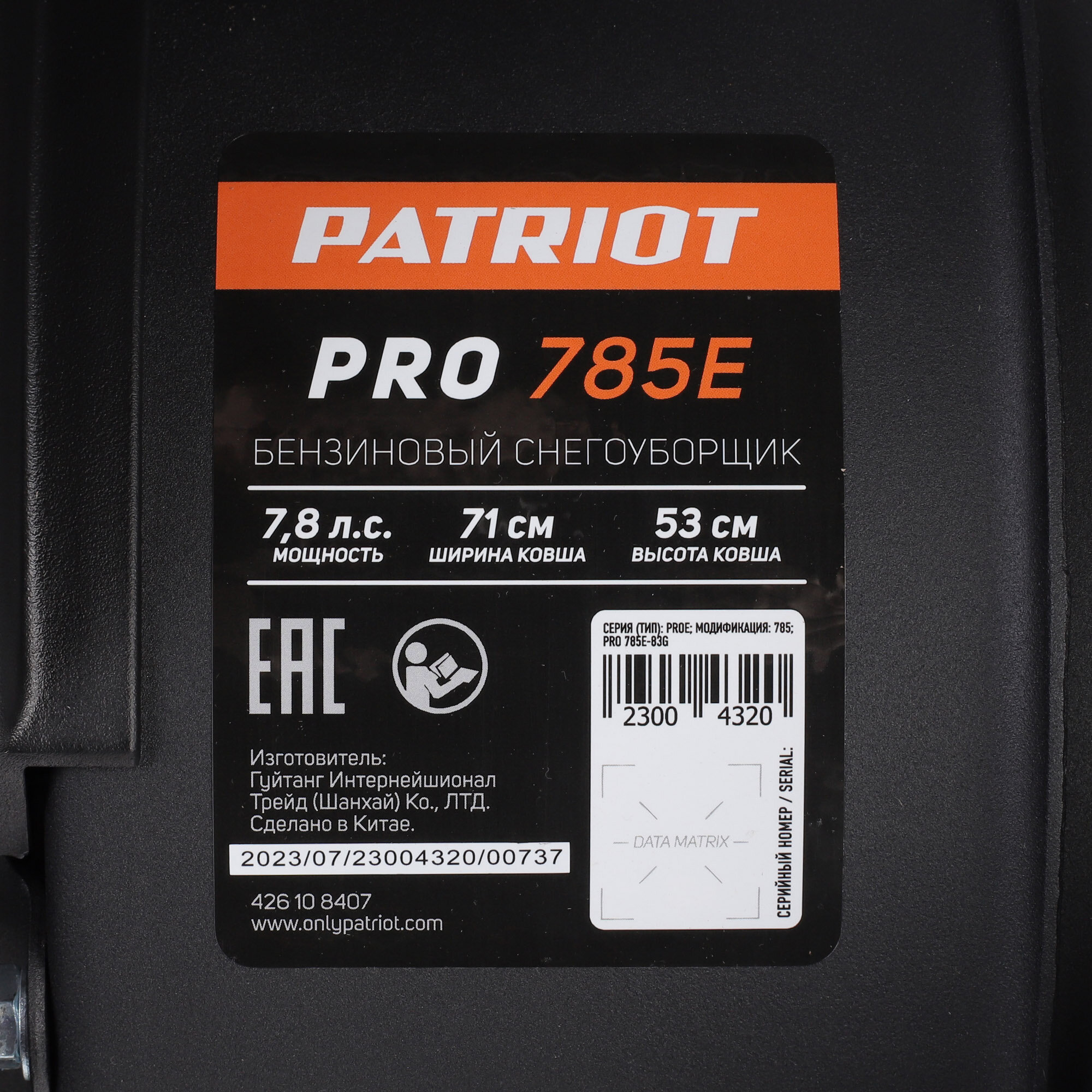 Снегоуборщик бензиновый, Patriot, PRO 785 Е, 7,8 л.с., 5736.9 Вт, 71х53 см, скор 6 вп/2 наз, руч ста