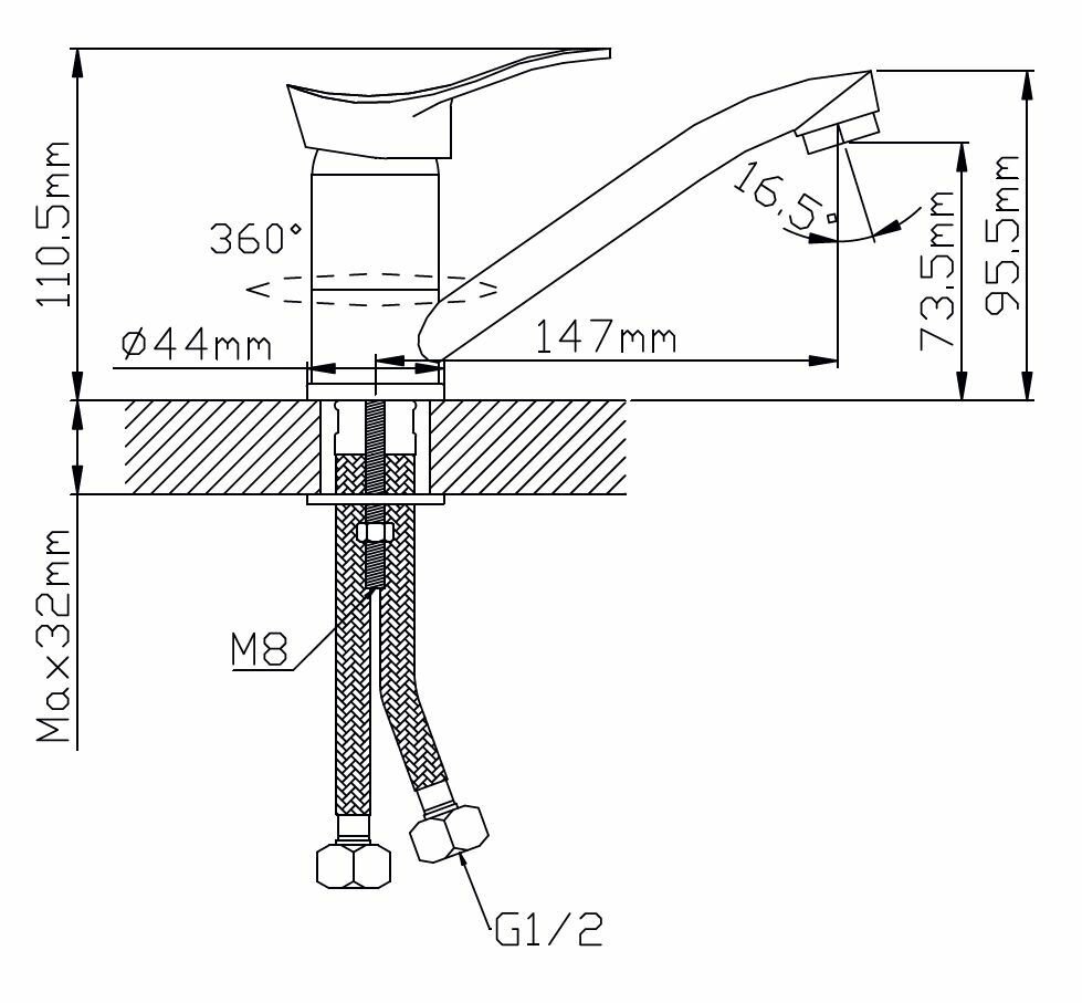 | Комплектация | смеситель, крепёж на шпильке, две подводки 1/2" длиной 35 см |