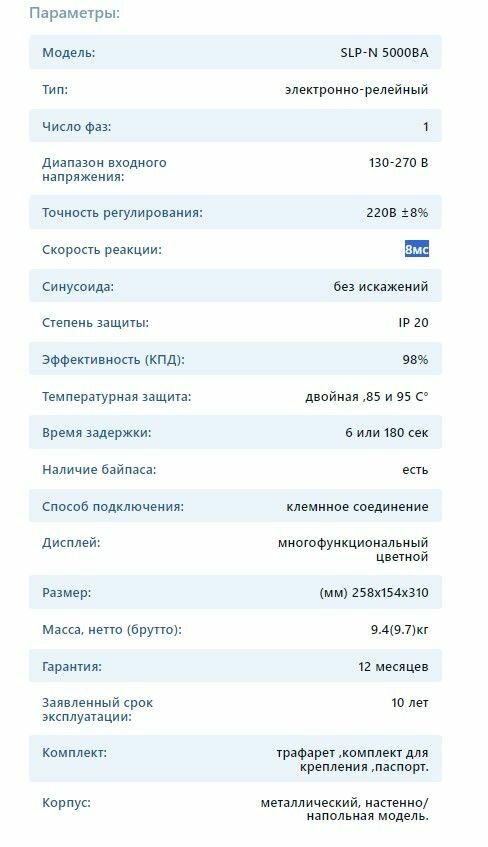 | Плюсы: | Стабилизирует, информативный дисплей, компактный, высокая скорость изменения напряжения сети. |