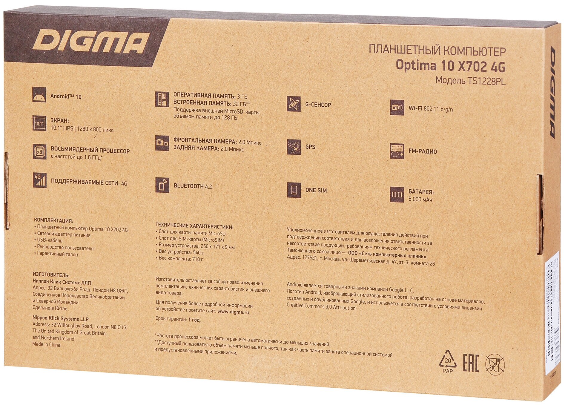 Планшет Digma Optima 10 X702 4G SC9863 (1.6) 8C RAM3Gb ROM32Gb 10.1" IPS 1280x800 3G 4G Android 10.0