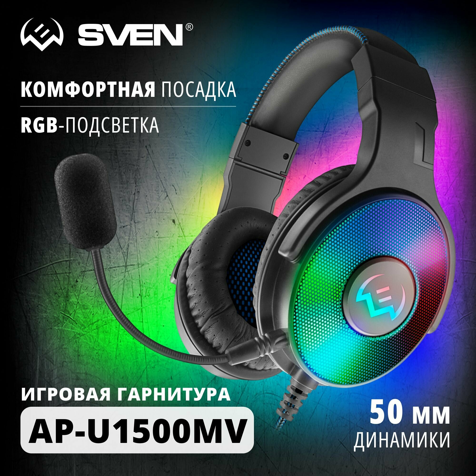SVEN AP-U1500MV Игровые наушники с микрофоном черные (USB, LED, 7.1, mini jack 3,5 мм (4 pin), 50 мм, RGB подсветка)