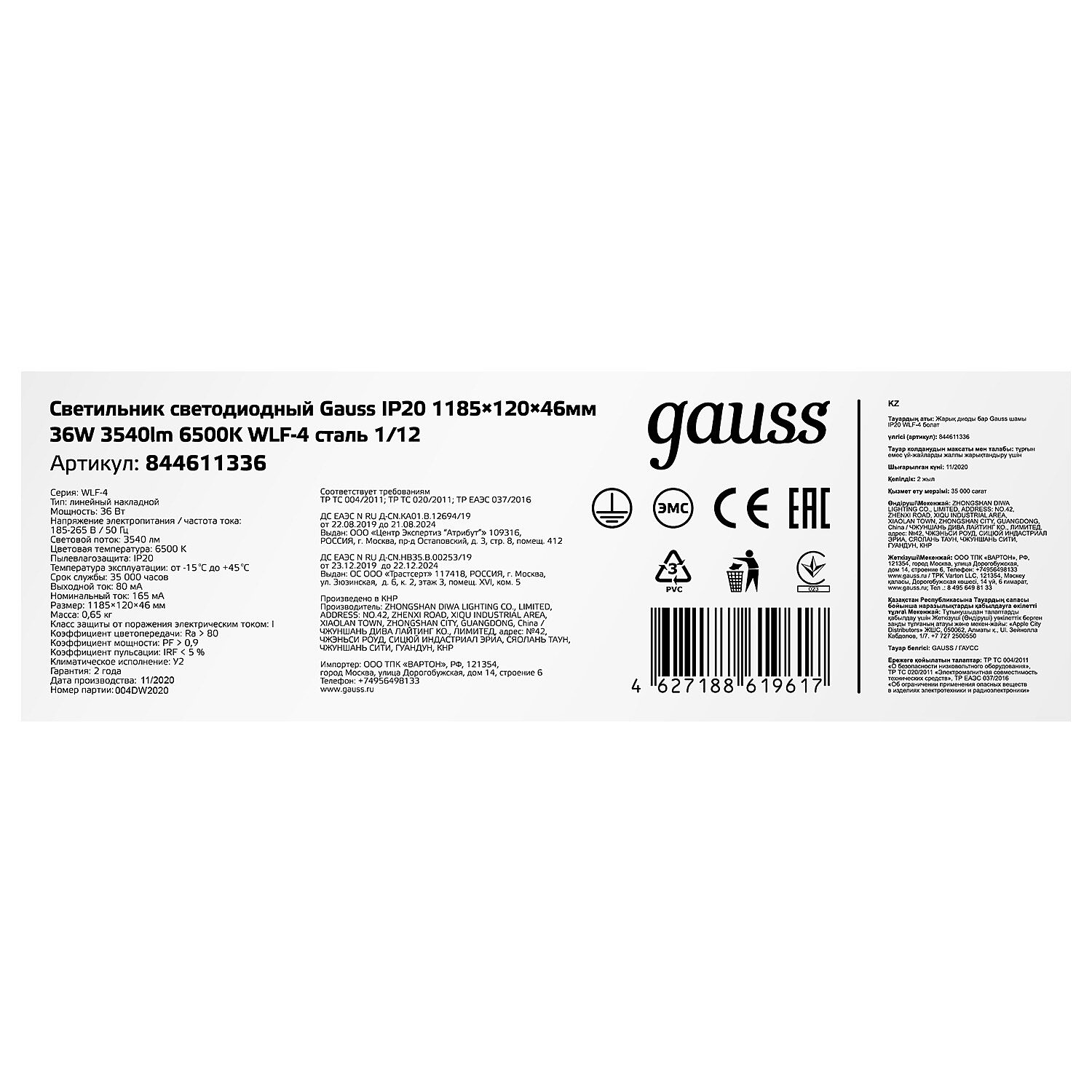 Линейный светильник Gauss WLF-4 36W 3540lm 6500K 185-265V IP20 1185*120*46мм сталь LED 1/12