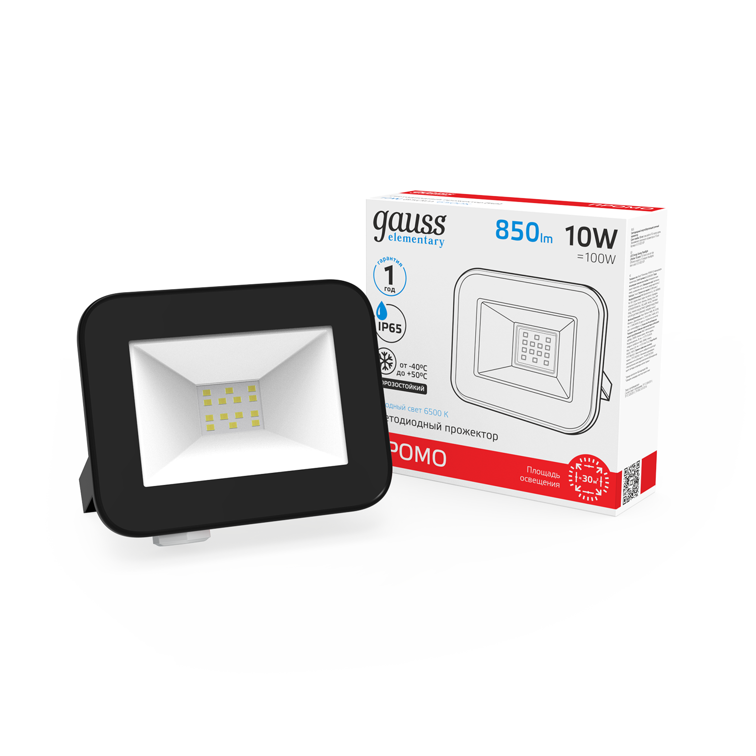 Прожектор светодиод 10Вт 6500К 850Лм IP65 черный PROMO СДО Gauss Elementary 1/10