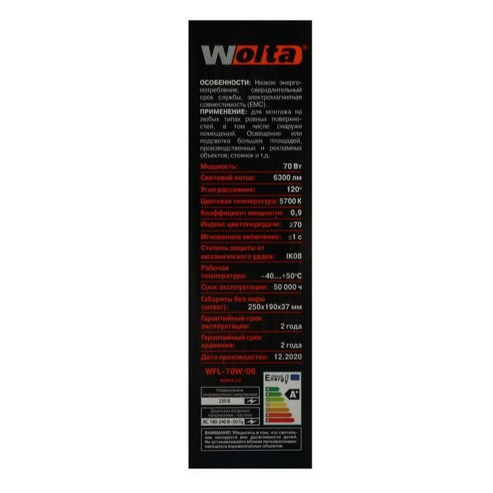 Прожектор светодиодный Wolta 70W (6000Lm) SMD 5500K 6K IP65 250x37x207мм черный WFL-70W/06