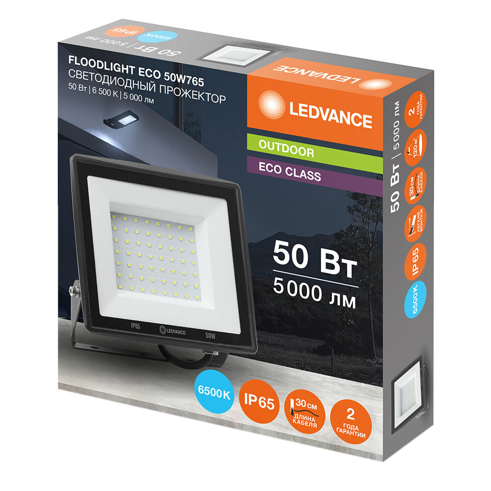 Прожектор светодиодный LEDVANCE Eco Class Floodlight LED 50W/4500/6500K Black IP65, 50 Вт, свет: холодный белый
